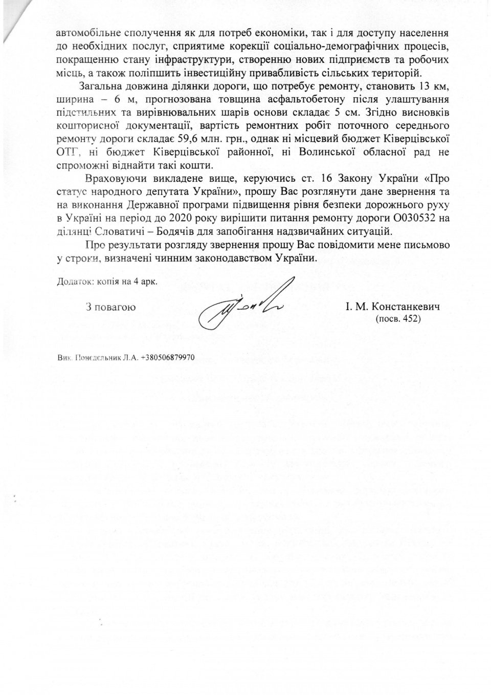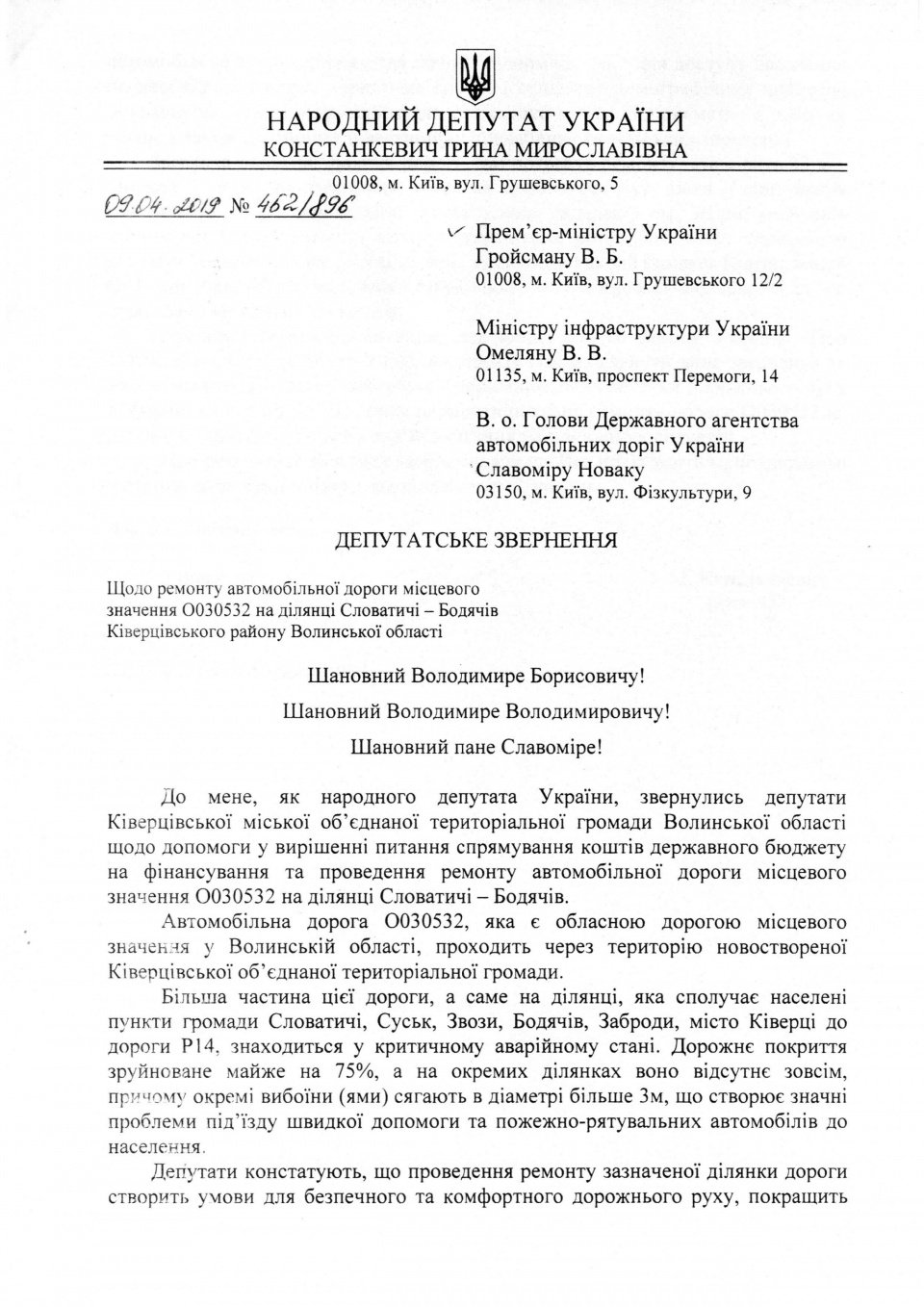 Відповідне депутатське звернення Ірина Констанкевич скерувала на адресу Прем’єр-міністра Володимира Гройсмана, Міністра інфраструктури Володимира Омельяна, в.о. голови Державного агентства автомобільних доріг України Славоміра Новака.