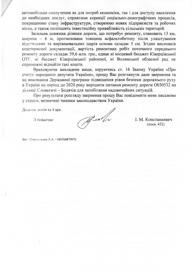 Нещодавно на адресу нардепа надійшло звернення від Ківерцівської об’єднаної громади щодо допомоги у вирішенні питання спрямування коштів державного бюджету на фінансування та проведення ремонту автомобільної дороги місцевого значення О030532 Словатичі – Бодячів.