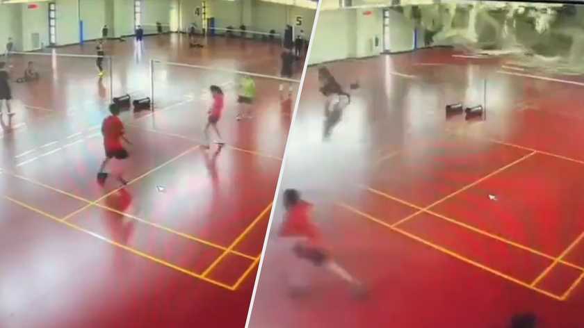 Аж раптом стеля будівлі почала обвалюватися на тих, хто перебував у спортзалі. На моторошних кадрах помітно, як уламки вмить накрили декількох людей, які першими намагалися втекти від удару.