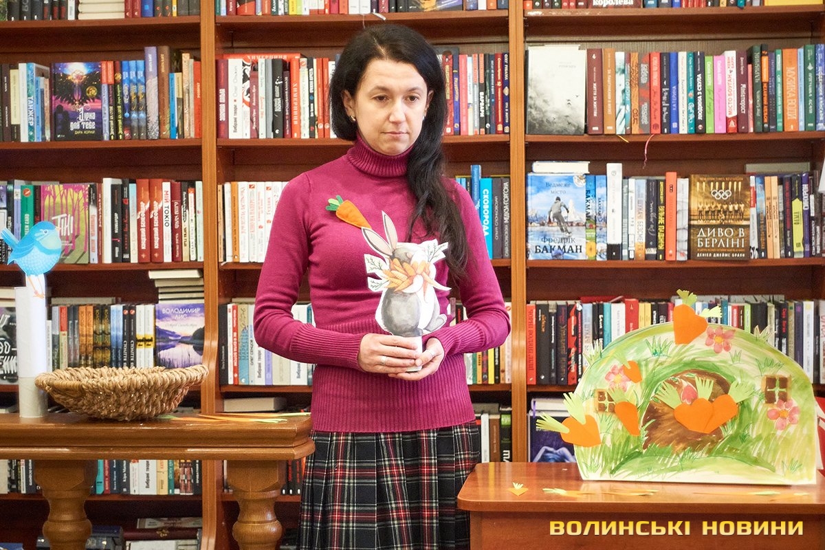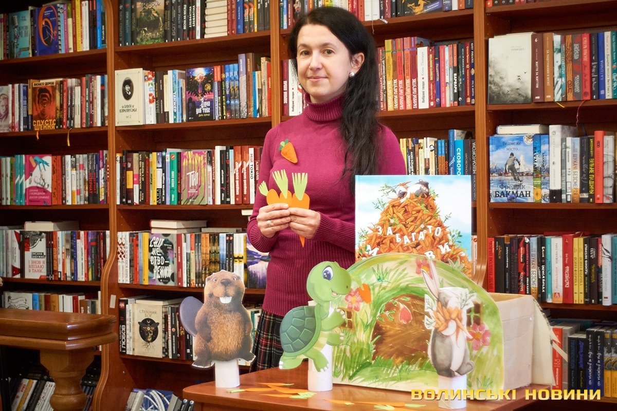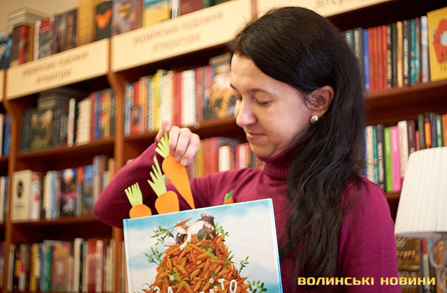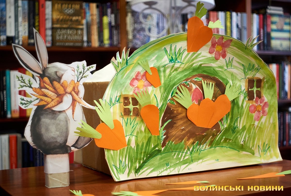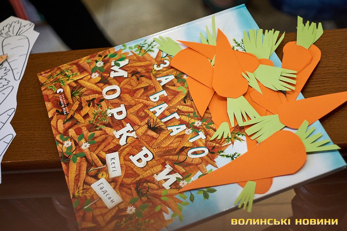 Дорослі та батьки добре знають — субота у луцькій книгарні «Є», зазвичай, проходить весело та з користю. Адже саме цього дня художниця та майстриня Ірина Сардак-Бондарук ділиться секретами створення різноманітних цікавинок із буденних речей.Сьогодні ж, захід відбувся у трохи незвичному форматі. Якщо на минулих заняттях діти вчилися створювати милих янголят та кумедних гномів, то нині наймолодші гості заходу подивилися цікаву виставу та отримали сувенір — морквину-закладинку.Ірина Сардак-Бондарук розповідає, що про такий формат «дитячої суботи» її неодноразово просили батьки зовсім юних дітей — віком 3-7 років. Адже для них традиційні майстер-класи не зовсім підходять. То ж і вирішила майстриня вигадати щось цікаве і, водночас, корисне.В основі історії — книга Кеті Гадсон «Забагато моркви». У коротенькому оповіданні йдеться про вуханя-колекціонера, який через надмірну любов до моркви так захаращив оселю, що не зміг до неї потрапити. Тому й довелося жадібному кролику просити друзів: черепаху, бобра та пташину про допомогу. Цим і цікава книга (як і більшість дитячих історій від «Видавництва Старого Лева») — проста історія має серйозну мораль та чудово проілюстрована. Батькам легко переповісти її наймолодшим читачам, а дітям — цікаво порозглядати малюнки.Перед виставою дітки, разом із батьками, мали змогу розмалювати «театральний реквізит» — паперові морквинки. А після виступу Ірина Сардак-Бондарук провела майстер-клас для батьків. Усі побачили, як із картонної коробки, кольорового паперу, шматків тканини, старого кошика та відрізку поліетилену можна створити власний театр.Майстриня розповідає, що створення реквізиту зайняло лише близько 2-х годин. Натомість, діти і дорослі не лише отримали задоволення від вистави, але й вкотре переконалися у правдивості твердження про те, що головний інструмент майстра — це фантазія.Фото Олександра Дурманенка.