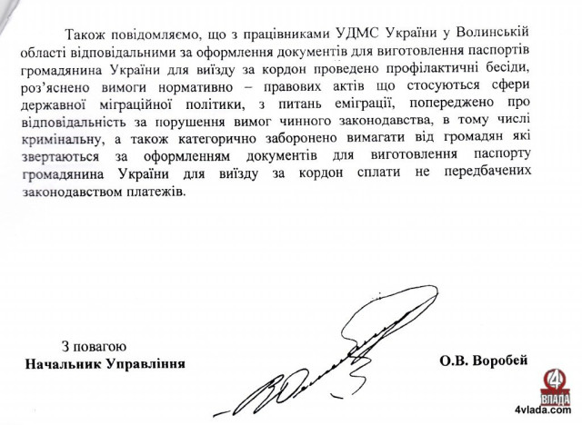 - То буде офіційна відмова людині, яка не захоче оплачувати обов’язкові платежі. На сьогодні є постанова Кабінету міністрів, є закони України. Будь-хто може зайти на сайт Державної міграційної служби в Інтернеті і там є всі розцінки і будь-який підрозділ ДМС України у Волинській області дотримується тих цін, які зараз є.