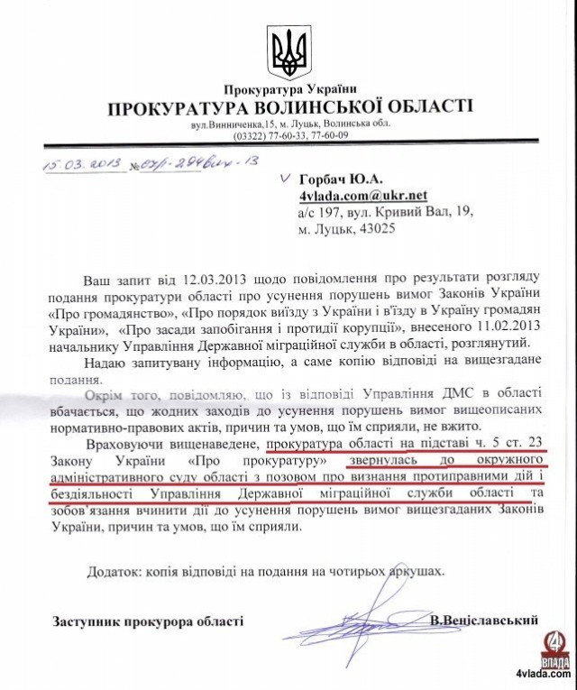 Так, прокуратура Волині після проведення перевірки подала позов на Управління Державної міграційної служби в області до окружного адміністративного суду.