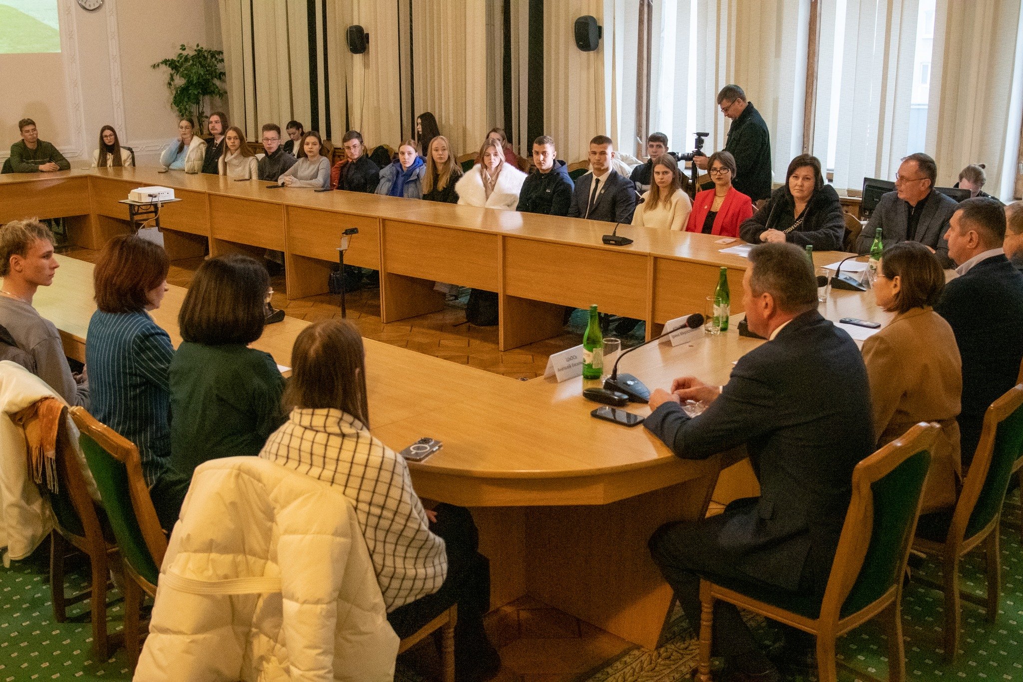 Голова обласної ради Григорій Недопад наголосив на важливості та перспективності такого діалогу зі студентським активом вишу. «Приємно, що ми сьогодні започатковуємо такі зустрічі студентства та членів Наглядової ради університету спільно з обласною радою, як найвищого представницького і колегіального органу нашого краю. Керівництво та депутатський корпус як представники громади, зацікавлені, щоб на Волині формувалося ініціативне та потужне покоління активних та амбітних молодих людей. Адже саме їм належить замінити нас та продовжувати розбудовувати нашу область і Україну після перемоги», – наголосив він.«Ми організували цю зустріч, щоб в рамках тижня підготовки до святкування дня студента в обличчя побачити кращих із кращих студентів університету і Волині, поспілкуватись із ними та надихнути на подальше успішне навчання. Це нестандартний захід, в рамках якого ми вирішили синхронізувати наші дії спільно із наглядовою радою, ректоратом та обласною радою», – додала парламентарка Ірина Констанкевич.Ректор ВНУ ім. Лесі Українки Анатолій Цьось висловив вдячність керівництву Наглядової ради вишу, які ініціювали та організували захід, що покликаний розширити кругозір та можливості студентства. «Ми робимо усе можливе задля того, щоб наші студенти здобули якісну освіту, адже це головна місія університету. У нас діють ряд програм: академічної мобільності, дуальної освіти і багато інших. Водночас, умови сьогодення ставлять перед нами нові виклики, спричинені війною, тому ми багато займаємось волонтерством, допомагаємо ЗСУ. Життя кожного дня змінюється, і ми бачимо, що майбутнє саме за активними людьми, які мають гарні професійні компетенції і при тому є небайдужими. І сьогодні дуже правильно та знаково, що студентський актив Лесиного вишу має таку зустріч саме в стінах обласної ради, де приймаються важливі для життєдіяльності області рішення», – зауважив він.