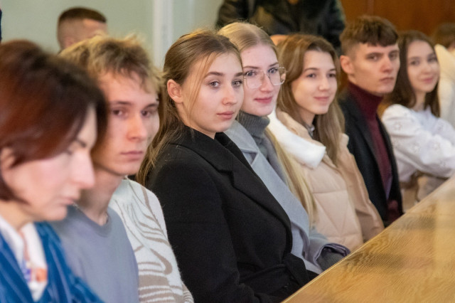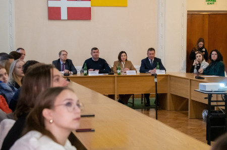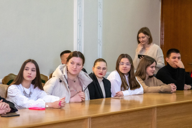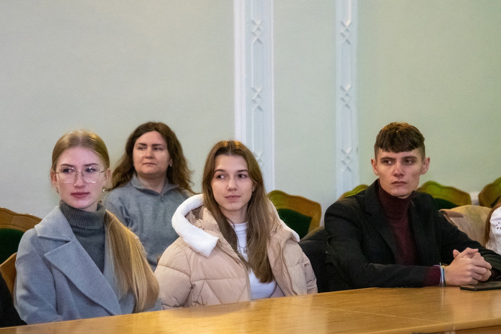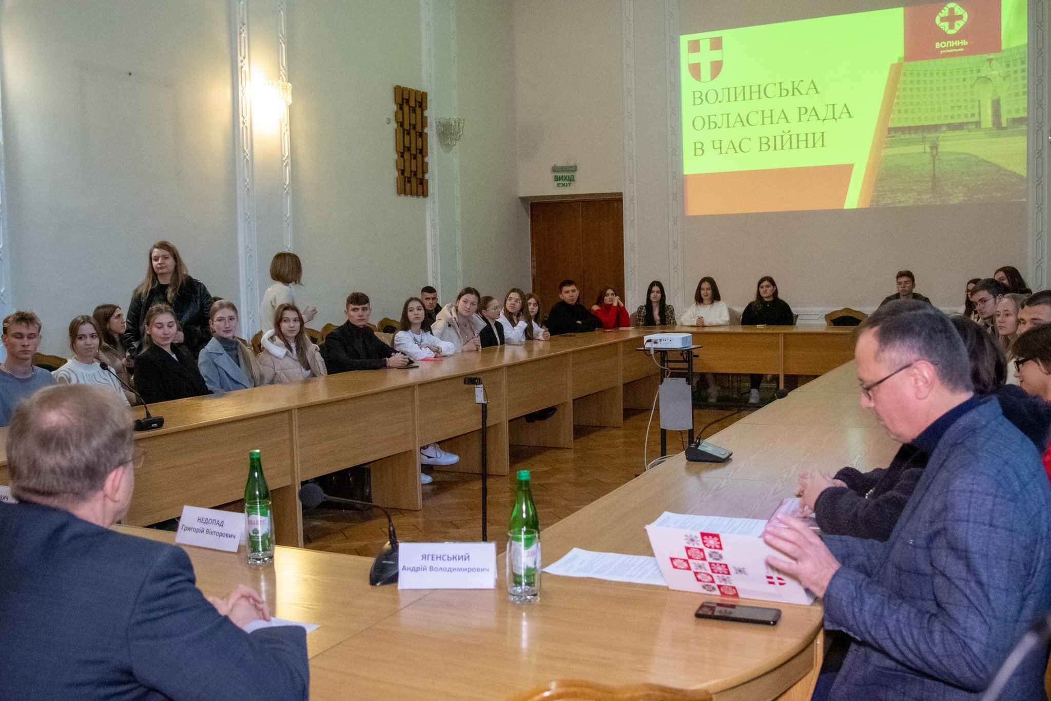 Голова обласної ради Григорій Недопад найперше поінформував студентство про основні напрями роботи головного представницького органу краю у період дії воєнного стану, що спрямовані передусім на підтримку українського воїнства, створення безпечних умов навчання, лікування, соціального захисту населення Волині та підтримку територіальних громад у цих процесах. Він детально розповів про волонтерську та гуманітарну місію облради, про реалізацію регіональних програм підтримки ветеранів війни та членів їхніх сімей, а також фінансове забезпечення Сил оборони та безпеки.