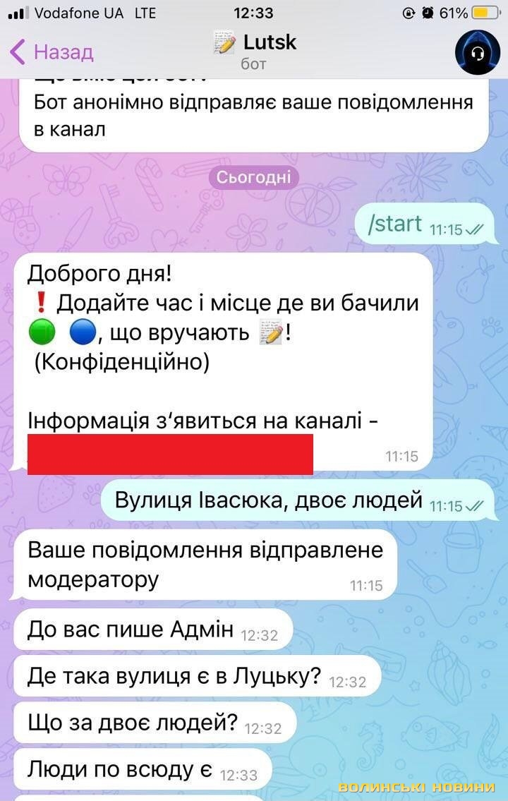 Механіка повідомлень у цих каналах проста: будь-хто може надіслати в бот повідомлення про те, кого і де він бачив. Надсилаємо повідомлення, що на вулиці Івасюка (якої, хай як це прикро шанувальникам митця, у Луцьку немає) двоє людей роздають повістки. Повідомлення одразу ж з’являється у каналі. І лише після того, як дехто з користувачів написав у коментарях, що такої вулиці не існує, повідомлення видалено.Експеримент другий: пишемо більш правдоподібне повідомлення. Читаючи географію попередніх постів, обираємо найближчий пункт, де є чимало людей. Таким чином в каналі з’являється інформація, що «біля ТЦ «Слон» на вулиці Кравчука в супроводі поліції працівники ТЦКіСП роздають повістки». Це вигадка до останнього слова: нікого там не було. Та вона не викликала ні в кого сумнівів. Тобто, фактично, ніхто не перевіряє, чи справді це так, тому достовірність і решти повідомлень – під сумнівом.Так само й опубліковані фото не доводять цих фактів, адже ідентифікувати місце за ними неможливо.