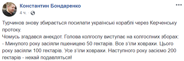«Турчинов знову збирається посилати українські кораблі через Керченську протоку. Чомусь згадався анекдот. Голова колгоспу виступає на колгоспні збори:
