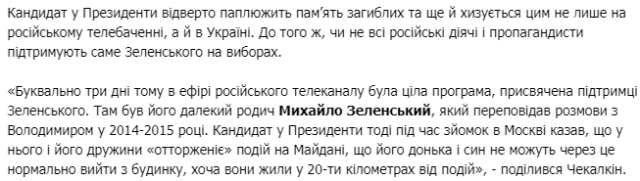 Перед другим туром президентських виборів риторика довірених осіб Петра Порошенка абсолютно змінилася. Якщо Ахтем Чийгоз висловлював здебільшого власні переконання без поливання бруду когось із опонентів Порошенка, то перекладач, дипломат, шоумен Дмитро Чекалкін одразу ж розпочав розхвалювати Петра Порошенка.Розповівши про історію своєї сім’ї, зокрема винищення її радянською владою, Чекалкін розповів, чому у другому турі не варто голосувати за Зеленського, при цьому знову похваливши Порошенка. Шоумен згадав те, що мовляв Зеленський жартував про беркутівців та майданівців. Однак, варто зазначити, що в цьому номері ці слова говорив актор 95-го кварталу Євген Кошовий, який грав роль мера Києва Леоніда Черновецького, та звертався він ними до Олександра Пекалова, який грав Віктора Януковича.Звучали від Дмитра Чекалкіна й звинувачення Зеленського в тому, що він є фактично проросійським кандидатом, хоча сам Чекалкін при цьому чомусь не згадував, що з 1989 по 1991 роки він навчався в аспірантурі Московського військового інституту іноземних мов, а згодом викладав у тому ж вузі, працював над кандидатською дисертацією. Та й варто зазначити, що російський актор, який є уособленням «русского мира», Іван Охлобистін зізнався, що ролик про кандидата Зеленського в нього замовили люди з оточення Петра Порошенка.Дмитро Чекалкін також вкотре похвалив Порошенка за те, що він погодився на дебати на стадіоні, а також звинуватив Зеленського в тому, що він перетворив свої умови на виставу. Звучали також звинувачення й в тому, що кварталівці вживали кокаїн – такі звинувачення постійно лунають від команди президента, проте не підкріплює це жодними доказами, крім провокативних роликів, де Зеленського збиває вантажівка або де на нього падає мішок кокаїну.Порівняв Чекалкін і статки обох кандидатів, мовляв, кварталівці жартували про офшори Порошенка, але на них було лише 3 тисячі доларів, в той час, як на офшорах «зеленої команди» 31 мільйон доларів, однак Чекалкін чомусь не згадав, що за рік президентства Порошенко збільшив дохід у 82 рази і він тепер становить 1,3 мільярда гривень, в той час коли Україна є однією з найбідніших країн Європи.Насамкінець Чекалкін порівняв 1+1 з російською прпагандистською машиною, адже, як відомо, «плюси» активно критикують чинного президента, якому щоправда це не завадило увірватися на ефір шоу «Право на владу».Студентів зганяли, або Чому відмовчується керівництво СНУ та ЛНТУ, яке дозволило агітувати в університетах