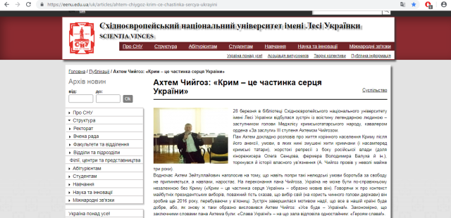 Ахтем Чийгоз виступав перед волинськими студентами 28 березня, тобто за декілька днів до першого туру виборів. Кримськотатарський політик багато розповідав про період початку анексії півострову, про супротив російській окупаційній владі, який триває й дотепер, а також про загрозу Путіна для всього світу, однак при цьому дозволяв собі агітувати за Петра Порошенка.