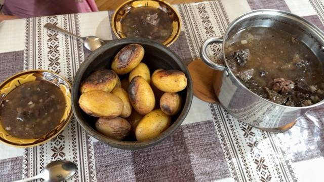 «Давай будемо їсти борщ. І будемо ждати миру, щоб приїхали наші діти, і ми зробили свіжину і всі зібралися до купи: і дітки, і внуки, і свати», – каже господиня.Як додала Галина Жипа, картопля у борщ не дається. З чорним борщем найкраще смакує запечена в лушпинні картопля у печі.