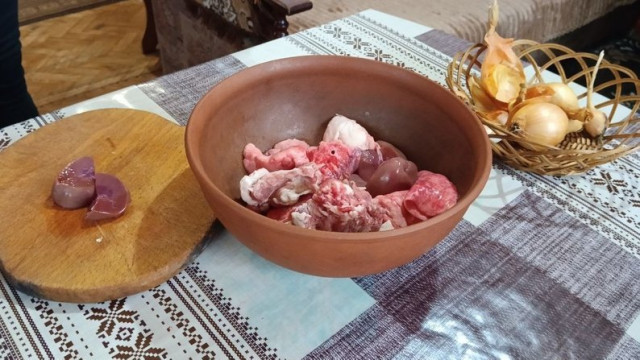 «Ми перед тим, як колоти кабана, бурячки червоні ріжемо кубиками й присолюємо водичку і квасимо в теплому місці в глечикові. Так смачніший борщ, щоб не додавати оцту, бо мають свою кислоту бурячки», – каже господиня.У каструлю з водою спершу кидають проціджені квашені буряки, кубиками нарізану цибулю і доводять до кипіння. Далі до борщу кидають субпродукти.