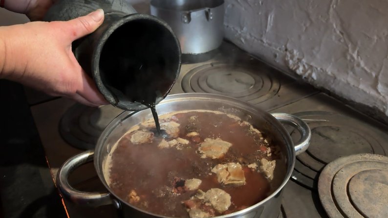 «Давай будемо їсти борщ. І будемо ждати миру, щоб приїхали наші діти, і ми зробили свіжину і всі зібралися до купи: і дітки, і внуки, і свати», – каже господиня.Як додала Галина Жипа, картопля у борщ не дається. З чорним борщем найкраще смакує запечена в лушпинні картопля у печі.