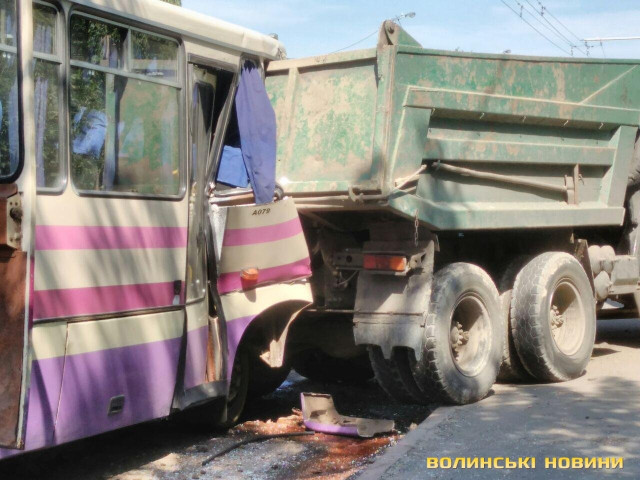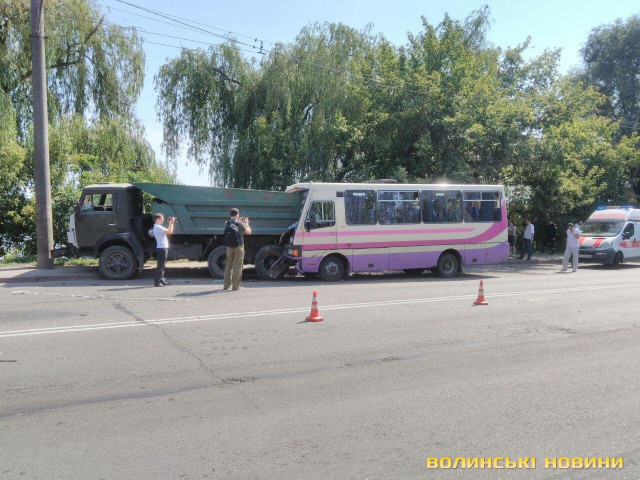 У серпні у Луцьку автобус врізався у вантажівку. ДТП трапилася на вулиці Ковельській на мосту між спиртзаводом і обласним госпіталем для інвалідів війни. Рейсовий автобус Луцьк-Колки-Рожище врізався в КамАЗ. На місці події працювало 5 машин швидкої.