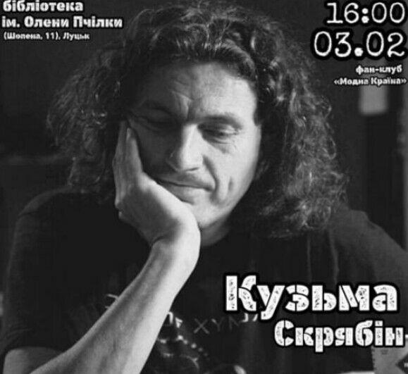 «3 лютого о 16:00, в бібліотеці імені Олени Пчілки відбудеться вечір пам‘яті Кузьми Скрябіна з нагоди четвертої річниці з дня трагедії. Запрошуємо усіх, хто має бажання вшанувати пам’ять Андрія, розділити з нами цей важкий день, та заспівати його пісні.