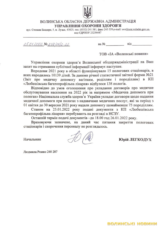 Наразі КП «Любешівська багатопрофільна лікарня» подала до НСЗУ документи і очікує рішення. Оскільки останній термін подання заявок – 18.00 26 січня, а згодом НСЗУ має розглянути подані документи, то питання скорочення персоналу і закриття пологових відділень у закладах не розглядалося, пояснюють в управлінні.Юлія МАЛЄЄВА