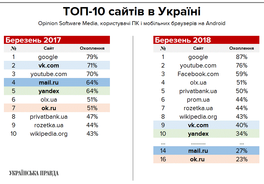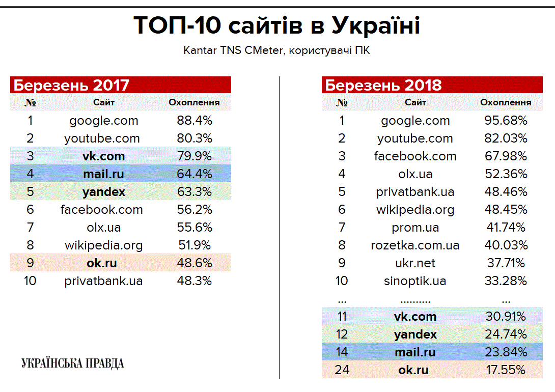 Схожа картина для "Яндекс" і "Mail.ru". У березні 2017 року вони входили у п'ятірку найпопулярніших сайтів серед українців разом з Google, YouTube і VK.