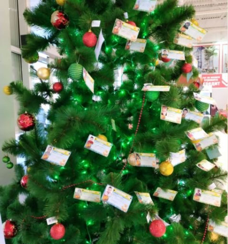 В холі гіпермаркету «Нова лінія» височіє яскраво оздоблена ялинка, головні прикраси якої – це листівки з побажаннями дітей та надією на чудо від Святого Миколая та небайдужих людей.