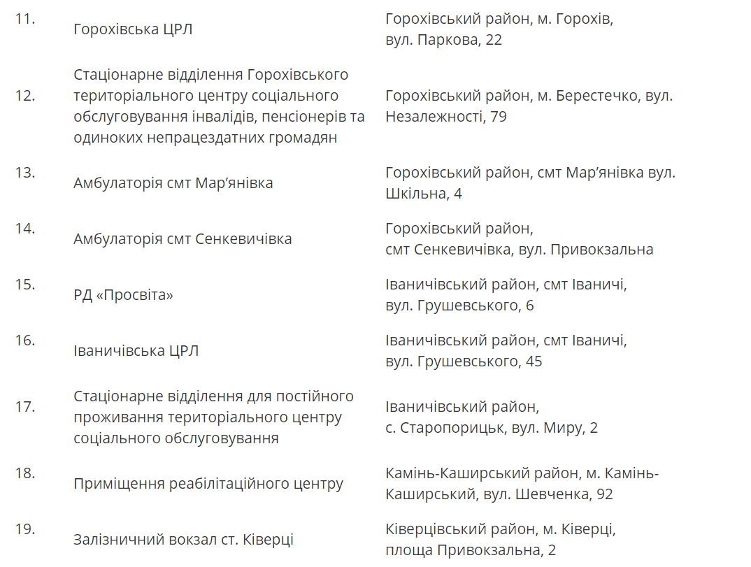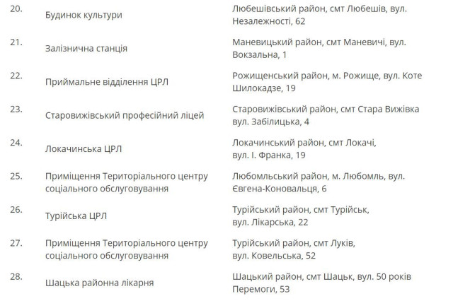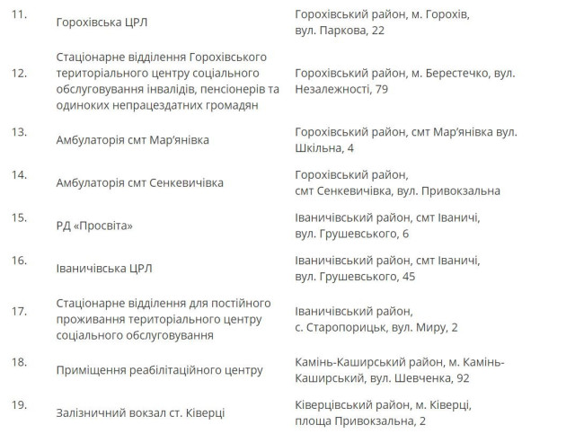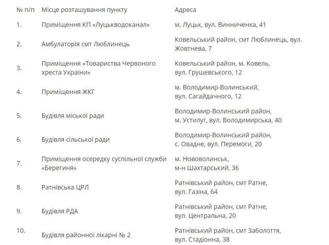 Адреси пунктів обігріву на території Волинської області станом на 09:00 15 січня 2018 року: