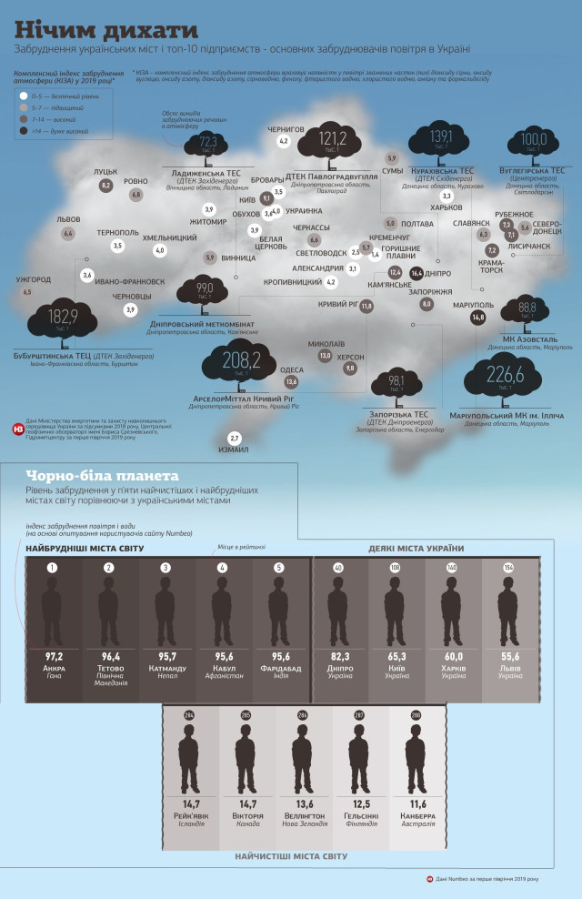У світовій гонці за чистим повітрям Україні, на жаль, похвалитися нічим. За версією глобальної бази даних Numbeo, до списку із 288 найбільш забруднених міст планети потрапили чотири українські міста – Дніпро (40-ве місце), Київ (108-ме), Харків (140-ве) та Львів (154-те).