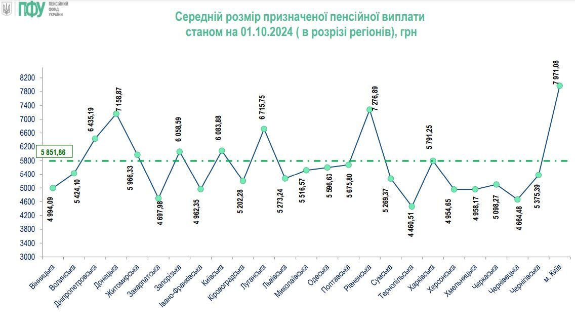 Найбільший середній розмір пенсійних виплат зафіксовано в Києві. Там пенсіонери в середньому отримують 7 971 гривню, згідно з даними ПФУ.