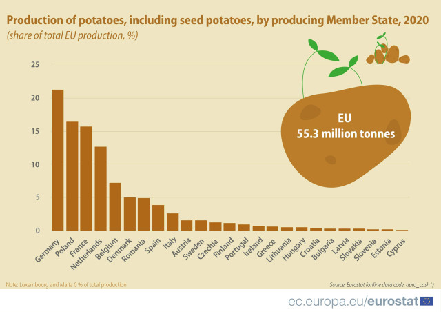 На перелічені вище п'ять держав-членів припадає майже 75% загального виробництва картоплі в ЄС.Цікаво, що, окрім експорту та торгівлі сирою картоплею для продуктів харчування та насіння, у європейських країнах популярно робити картопляні напівфабрикати та крохмаль. А картопля фрі та чипси є головними продуктами з картоплі.