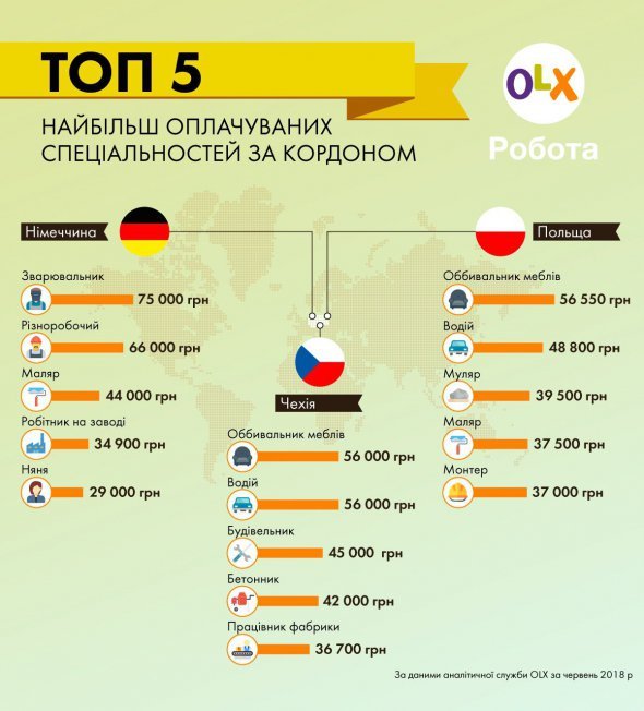 Ця країна є лідером з працевлаштування українців. У Польщі найвищі зарплати пропонують оббивальникам меблів - 56 550 грн. Середня зарплата водія - 48,8 тис, муляра - 39,5 тис, маляра - 37,5 тис, монтера - 37 тис. грн.