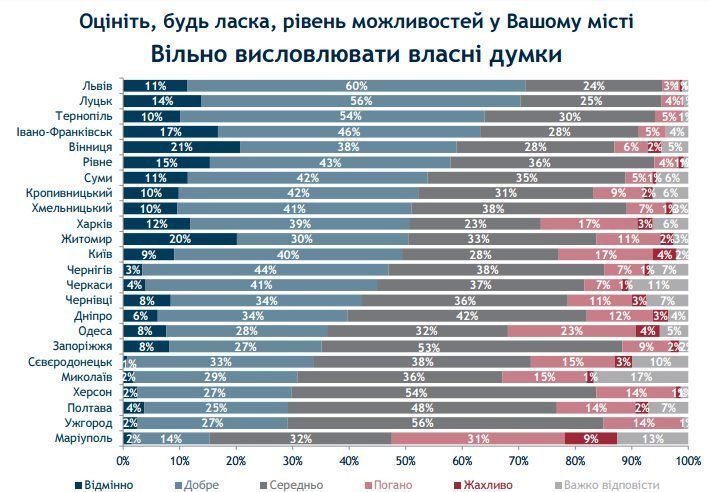 Тим часом рівень свободи на «хорошому» рівні назвали більше 50% жителів таких міст як Луцьк, Львів і Тернопіль.