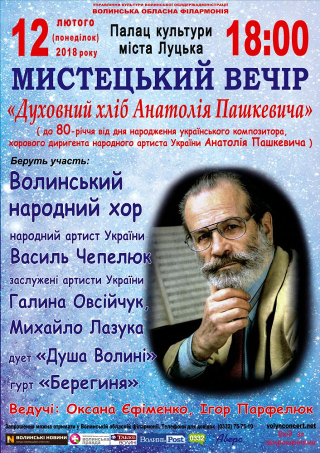 Мистецький вечір «Духовний хліб Анатолія Пашкевича» у Палаці культури міста | 12 лютого