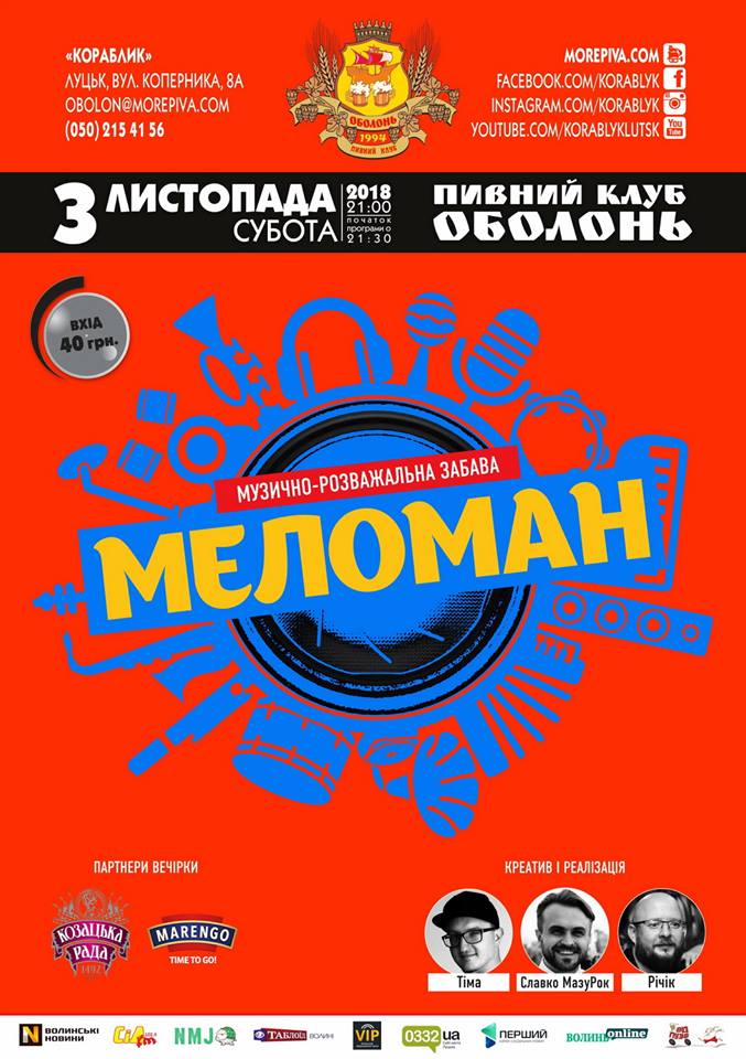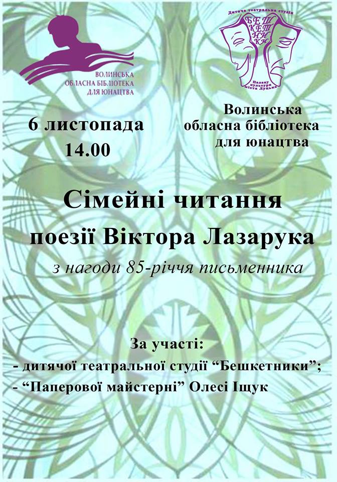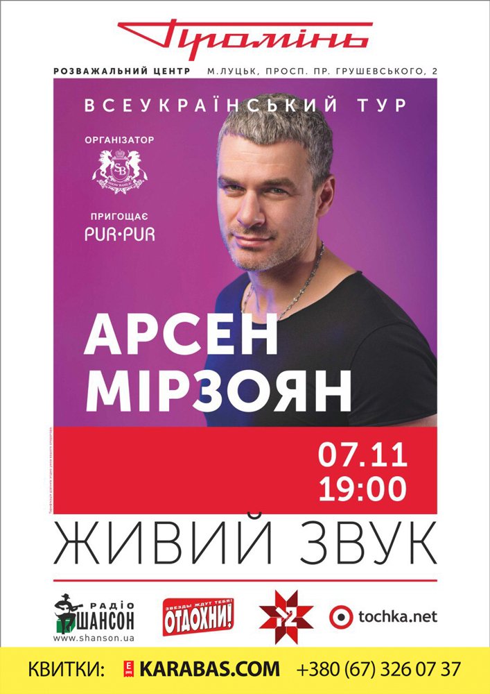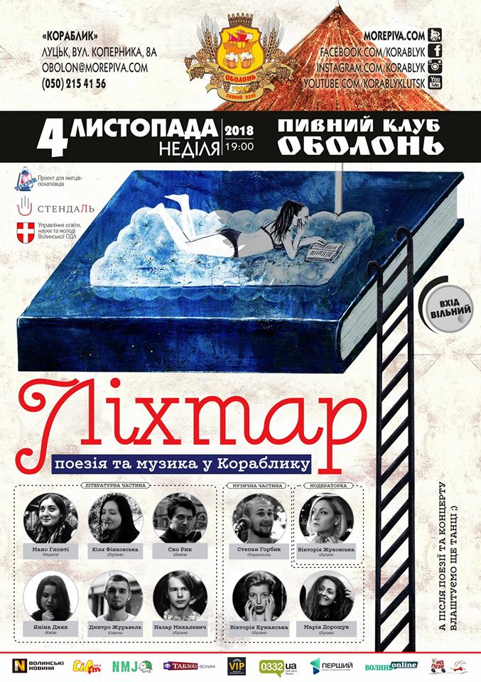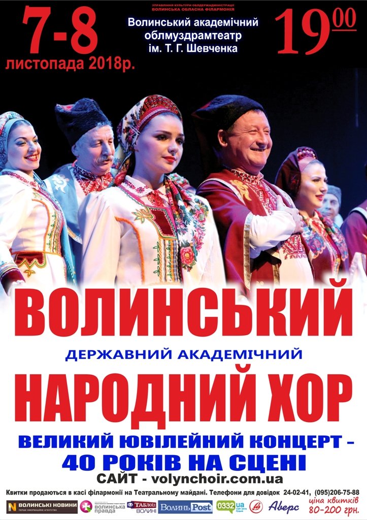 Всеукраїнський фестиваль співаної поезії та авторської пісні «Оберіг» у Палаці культури міста Луцька| 1–3 листопадаМегафінал ІХ Національного конкурсу краси «Міс принцеса України» у Волинському обласному академічному музично-драматичному театрі імені Тараса Шевченка | 2 листопадаТільки Хіти. Танці в пивному клубі «Оболонь» | 2 листопадаВиставка робіт Сірого Сержа «В горах» у РЦ «Промінь» | 2 листопада – 18 грудняКонцерт Pianoбоя у РЦ «Промінь» | 3 листопадаТренінг «Teambuilding: як працювати разом та не вмерти по дорозі» в Молодіжному центрі Волині | 3 листопадаМузично-розважальна забава «Меломан» у пивному клубі «Оболонь» | 3 листопадаЛіхтар: поезія та музика в пивному клубі «Оболонь» | 4 листопадаКонцерт «Прогулянка і загублене танго» в Палаці культури міста Луцька | 4 листопада«VIP Тернопіль Comedy Шоу» у Волинському обласному академічному музично-драматичному театрі імені Тараса Шевченка | 5 листопадаЧитання поезії Віктора Лазарука у Волинській обласній бібліотеці для юнацтва | 6 листопадаКонцерт Арсена Мірзояна у РЦ «Промінь» | 7 листопадаПрезентація збірки Ігоря Астапенка «Шампанське–пиво–шампанське» у книгарні «Є» | 7 листопадаКонцерт Волинського державного академічного українського народного хору «40 років на сцені» у Волинському обласному академічному музично-драматичному театрі імені Тараса Шевченка | 7–8 листопадаПідпільний стендап у РЦ «Промінь» | 8 листопада