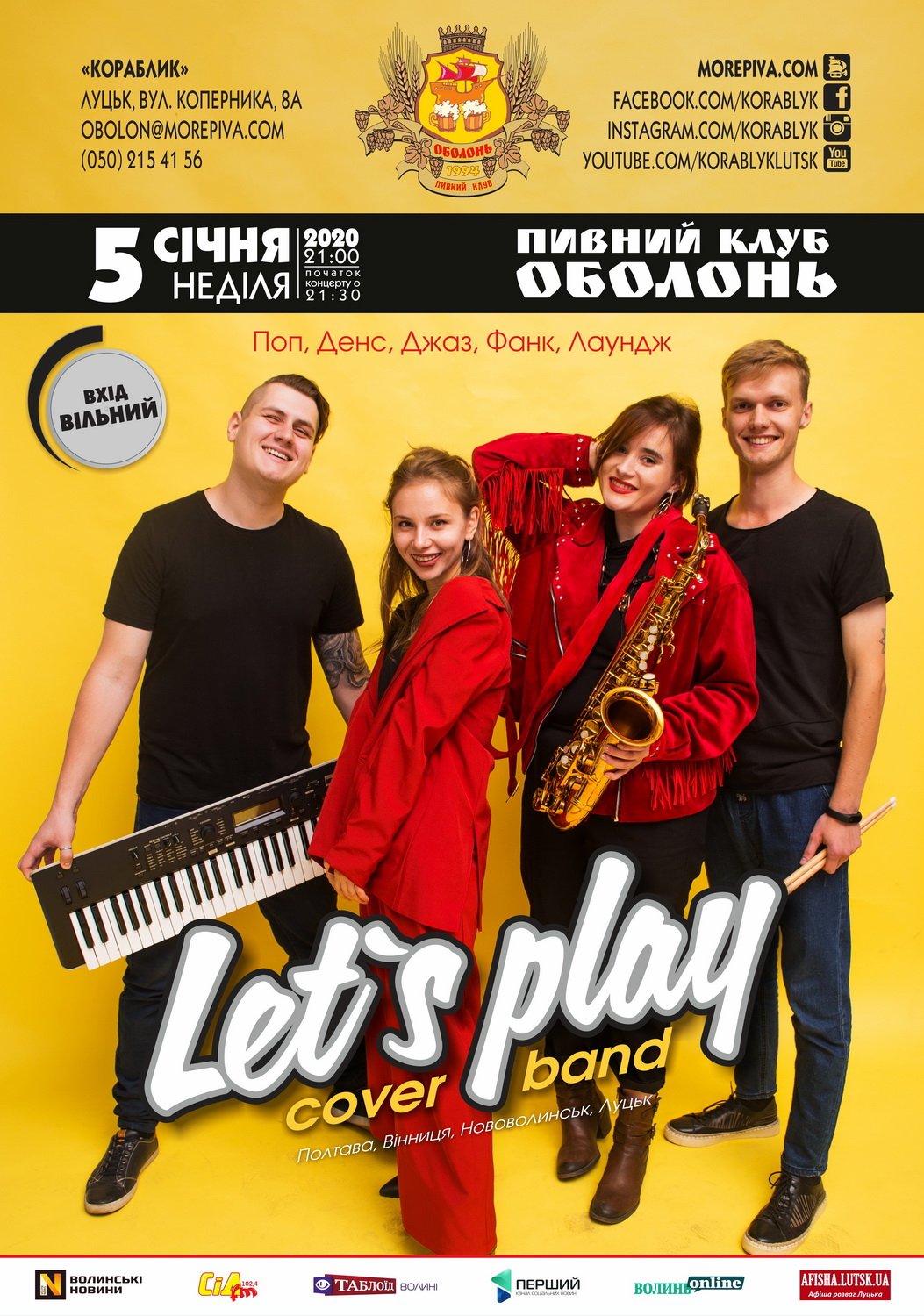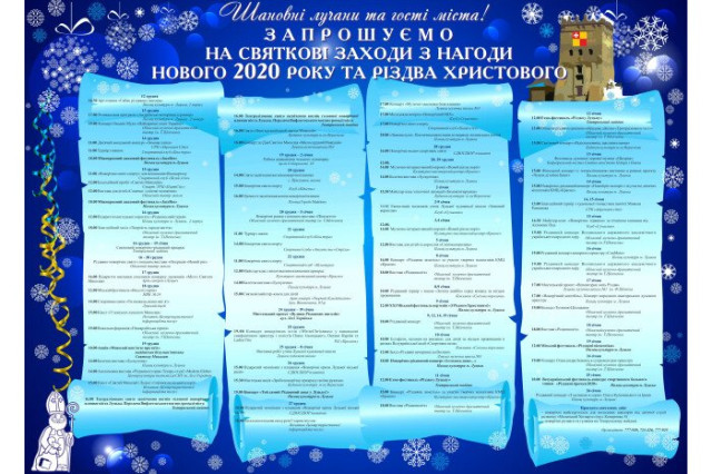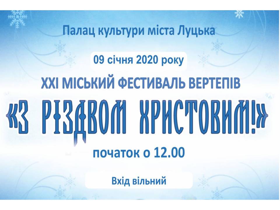 Лише вершки: 1990-2019. Танцi у пивному клубі «Оболонь» | 3 січняСмачна Дискотiвка у пивному клубі «Оболонь» | 4 січняVI Різдвяна коляда 2020 від Асоціації футзалу Волинської області у СК «Арена Спорт» | 4–5 січняВолонтерський день у КП «Ласка» | 4 січняAvecarnival Bday eve у Lss | 4 січняГурт «LET’S PLAY COVER BAND» у пивному клубі «Оболонь» | 5 січняВистава для дітей та дорослих «Снігова Королева» у Палаці культури міста Луцька | 5 січняРіздвяні гоцалки в пивному клубі «Оболонь» | 7 січняКонцерт «Різдвяна заметіль» за участю творчих колективів КМЦ «Красне» у Палаці культури міста Луцька | 8 січня Міський фестиваль вертепів «З Різдвом Христовим!» | 9 січняВиставка робіт Людмили Бойчук у РЦ «Промінь» | до 6 січня