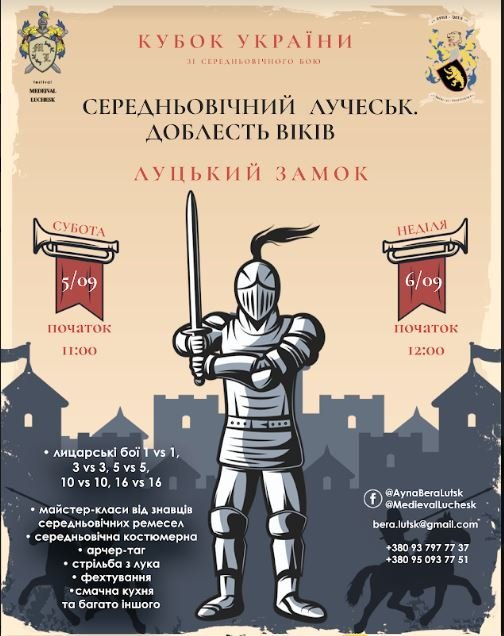 Навчання у Волинській жіночій бізнес-спільноті «Соціальне підприємництво та соціально відповідальний бізнес: переваги, відмінності, можливі ідеї співіснування» у Consulting Center | 3 вересняМайстер-клас Fluid Art у готелі «Світязь» | 4 вересняXV Міжнародні змагання з легкої атлетики зі спортивної ходьби за участі світових зірок «Луцька десятка» біля пам'ятника Тарасу Шевченку | 5 вересняДожили до осені. Сергій Шишкін та друзі в клубі «Цитра» | 4 вересняЗустріч із українськими письменниками на Вишкові (вулиця Вахтангова, 10) | 4 вересняЗустріч від Молодіжного центру Youth Сфера «А давайте підемо в Музей Корсаків» у Музеї сучасного українського мистецтва Корсаків | 4 вересняАматорський турнір з вільної піраміди в George’s club | 5 вересняБазовий курс: перша домедична допомога в Луцьку від Курсів першої допомоги САВ | 5 вересняКубок України із середньовічного бою «Середньовічний Лучеськ. Доблесть віків» у замку Любарта | 5-6 вересняDmytruk Luchesk Half Marathon | 6 вересняWOW:ранок Ефективність соцмереж для бізнесу і не тільки: special edition від PRO Business HUB | 7 вересняТренінг «Мистецтво продажу. Чого насправді хоче клієнт?» у Молодіжному центрі Волині | 10 вересня