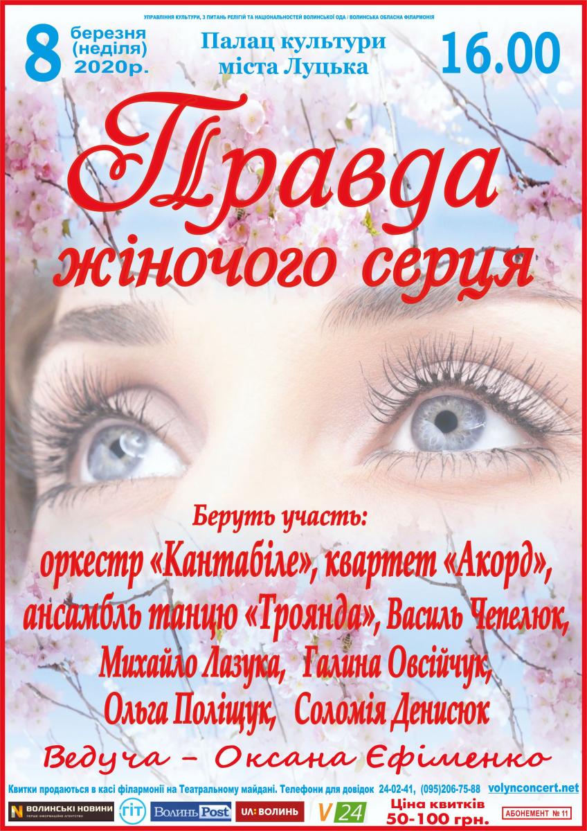 Презентація «По світу по освіту: про міжнародні стипендійні програми» у головному корпусі СНУ імені Лесі Українки | 5 березняЛекція «Жіночий рух&Українська революція» у Волинському краєзнавчому музеї | 5 березняКонцерт Степана Гіги в драмтеатрі імені Тараса Шевченка | 6 березняНарешті п’ятниця! Відривна дискотівка в пивному клубі «Оболонь» | 6 березняОлександр Копил aka DJ OK Selekta у клубі «Цитра» | 6 березняВистава «Обережно – жінки» в драмтеатрі імені Тараса Шевченка | 6 березняГурт «Очеретяний кіт» у пивному клубі «Оболонь» | 7 березняLUTSK OPEN – Ukraine Jiu Jitsu League Championship GI у ДЮСШ | 7 березняГурт Janis у пивному клубі «Майдан» | 7 березняТренінг «Діалог із тілом» у театральній майстерні «ДогориДриґом» | 7–8 березняКонцерт «Жінка. Весна. Кохання» в драмтеатрі імені Тараса Шевченка | 7, 8 березняВистава «Попелюшка» в театрі ляльок | 8 березняРадіоХіти. Танці в пивному клубі «Оболонь» | 8 березня«Казки Ж» або чоловікам вхід заборонений у Гармидер ангар-stage | 8 березняКонцерт «Правда жіночого серця» у Волинській обласній філармонії | 8 березняВистава «Чарівна лампа Аладдіна» в драмтеатрі імені Тараса Шевченка | 8 березняМайстер-клас із макіяжу від професійного візажиста Юлії Рябіїк у ЦУМі | 8 березняСвято весни. Романтичні хіти з Мікаелем Гюлазяном у клубі «Цитра» | 8 березняШоколадний майстер-клас у кав’ярні «Старе місто» | 8 березняКонцерт Melovin у РЦ «Промінь» | 9 березняКонцерт до Шевченківських днів у залі факультету культури і мистецтв СНУ імені Лесі Українки | 10 березняВистава «Химерна Мессаліна» в драмтеатрі імені Тараса Шевченка | 12 березняІсторія Німих Рубців від Марі Дорощук у Молодіжному центрі Волині | 12 березня