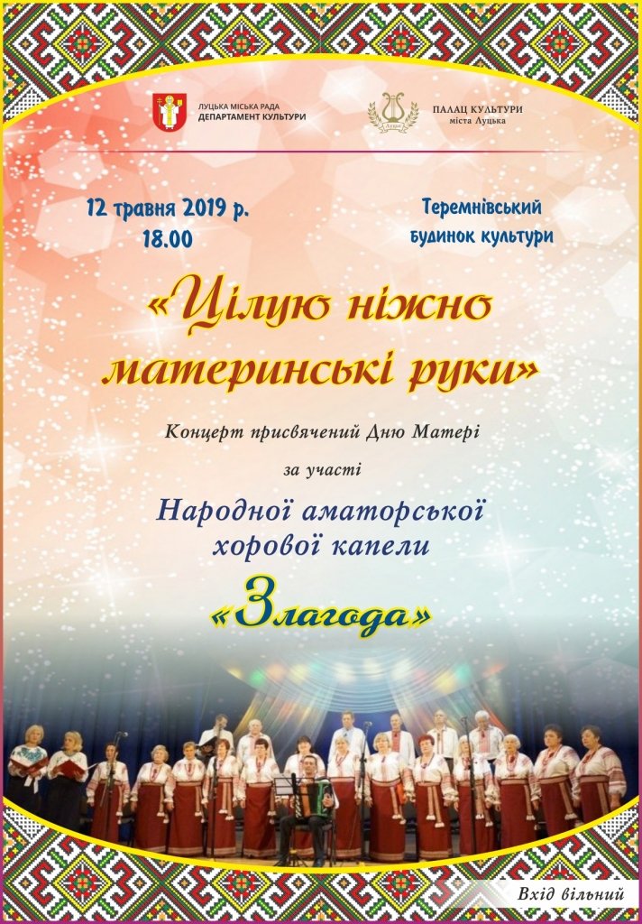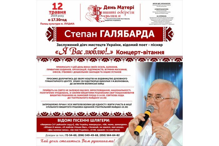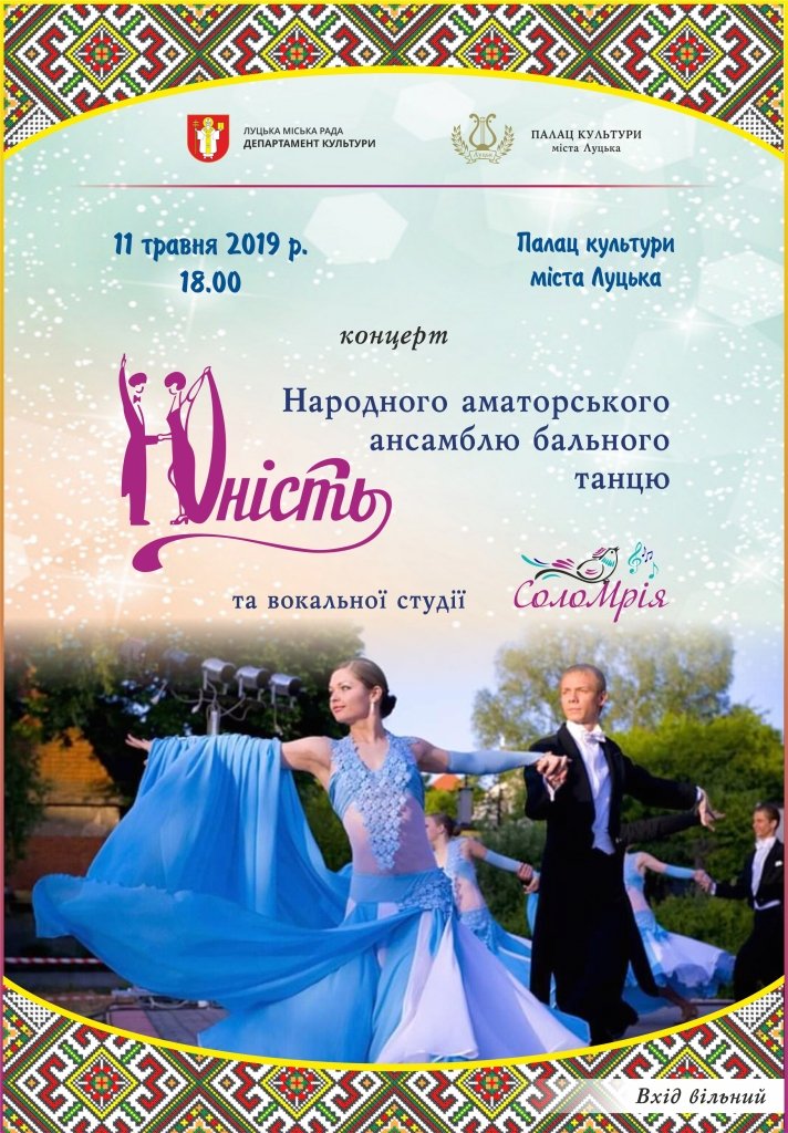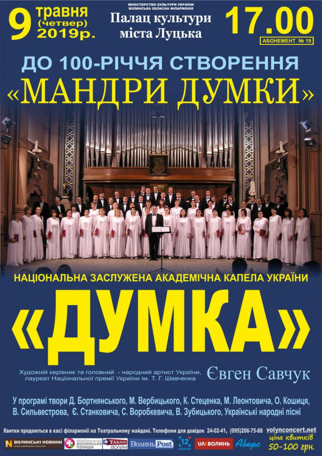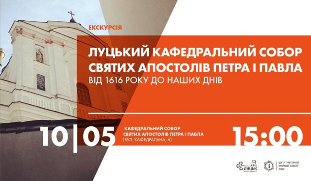 Відкриття персональної виставки Павла Юрчука «Ледь абстрактне і трохи військове» у Галереї мистецтв | 8 травняКонцерт до 100-річчя Національної заслуженої академічної капели «Думка» | 9 травняЕкскурсія до кафедрального собору Святих Апостолів Петра і Павла від Центру туристичної інформації та послуг | 10 травня«Чорні черешні». Вечір гарної атмосфери та хорошої музики в пивному клубі «Майдан» | 10 травня«Античні коди України. Сакральні реконструкції» у Музеї сучасного українського мистецтва Корсаків | 10 травняКонцерт народного аматорського ансамблю бального танцю «Юність» у Палаці культури міста Луцька | 11 травня«Ціна Ритму». Презентація альбому «Вічний Двигун» у ZAVIDE | 11 травняLutsk Food Fest: Гастро-тур у Луцькому замку | 11–12 травняВистава «Веселі пригоди на лісовій галявині» у Волинському академічному обласному театрі ляльок | 12 травня#LutskFamilyFest у Центральному парку культури і відпочинку імені Лесі Українки | 12 травняКонцерт «Цілую ніжно материнські руки» в Палаці культури міста Луцька | 12 травняX Всеукраїнський фестиваль «Вишиті обереги єднання» на Театральному майдані | 12 травняВистава «Безталанна» у Волинському академічному обласному музично-драматичному театрі імені Тараса Шевченка | 12 травняКонцерт народного аматорського духового оркестру в Палаці культури міста Луцька | 13 травняВистава «Про що мріють зірки» у Волинському академічному обласному музично-драматичному театрі імені Тараса Шевченка | 13 травняЕтно-гурт «Дуліби» в Палаці культури міста Луцька | 14 травняВистава «Обрежно – жінки» у Волинському академічному обласному музично-драматичному театрі імені Тараса Шевченка | 15 травняВистава «Циганка Аза» у Волинському академічному обласному музично-драматичному театрі імені Тараса Шевченка | 16 травня