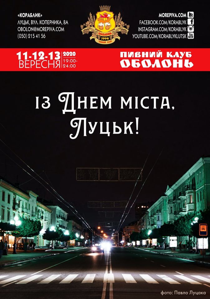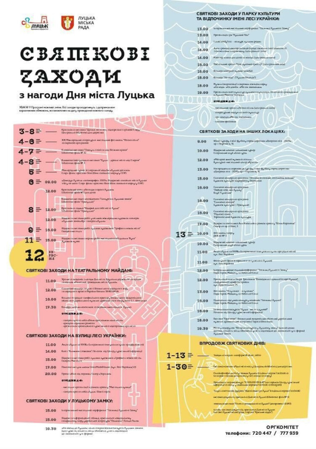 Читайте також: Як у Луцьку святкуватимуть День міста. ПрограмаКвест «Княжими стежками» в Центрі туристичної інформації та послуг | 12 вересняВечірка нового часу в РЦ «Промінь» | 12 вересняПерегляд відео про Луцьк і Вальдемара Пясецького в сквері «Зоряний» | 12 вересняБезкоштовний майстер-клас для дітей із приготування тістечок у гіпермаркеті «Там-Там» | 12 вересняКонцерт органної музики «Народжені вітром» у кафедральному костелі Святих Апостолів Петра і Павла | 13 вересняКонцерт «Танго останньої надії» у Палаці культури міста Луцька | 17 вересня