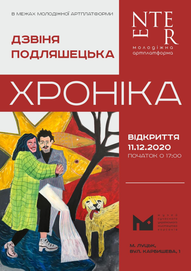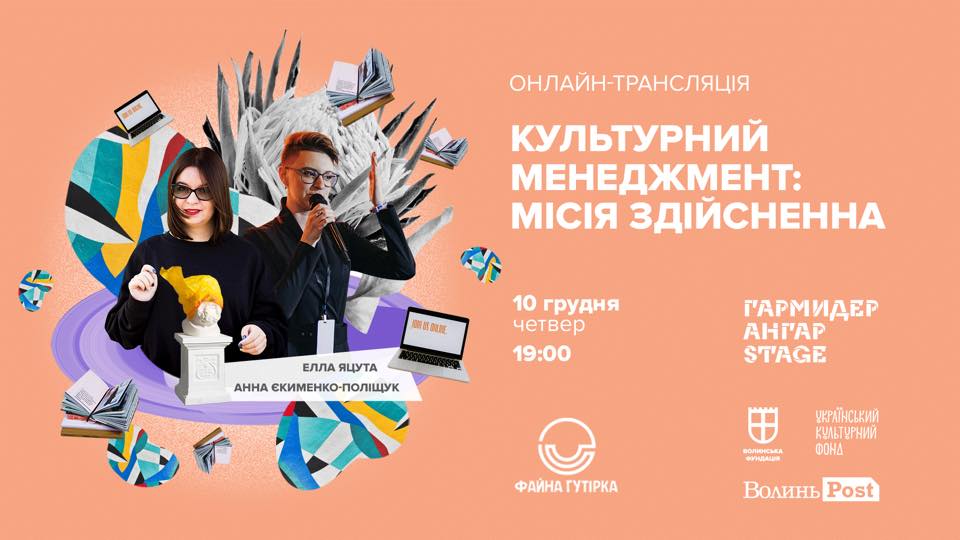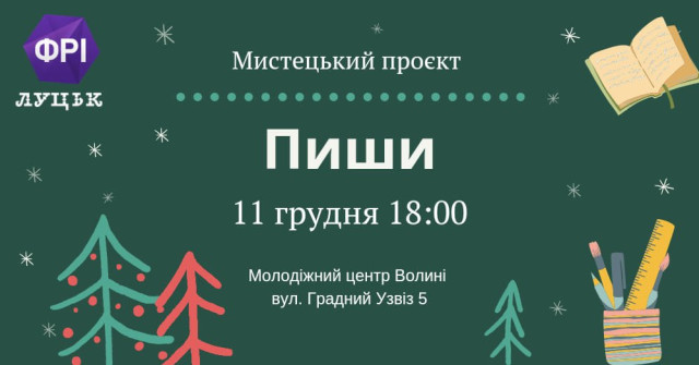 Сценарна майстерня «Твоя історія – для сцени!» у Гармидер ангар-stage | 8-12 грудняОнлайн-трансляція файної гутірки «Культурний менеджмент: місія здійсненна» у Гармидер ангар-stage | 10 грудняVinyl radio з Сергієм Ткачуком у пивному клубі «Майдан» | 10 грудняВідкриття персональної виставки Дзвіні Подляшецької «Хроніка» в Музеї сучасного українського мистецтва Корсаків | 11 грудняАндріївські вечорниці для молоді Луцька у Волинському краєзнавчому музеї | 11 грудняМайстер-клас для дорослих «Чуттєвий живопис» у художній студії «Барва» | 11 грудняМистецький проєкт «Пиши» у Молодіжному центрі Волині | 11 грудняОфіційне відкриття осередку Демократичної сокири в Луцьку в «Короні Вітовта» | 11 грудняVinyl party з Сергієм Ткачуком у клубі «Цитра» | 11 грудняWOW: ранок. Прокачай свій бізнес у «Сулі Гулі» | 12 грудняФорум-спектакль «Трикутник» у Гармидер ангар-stage | 12 грудняАкустика від Outcry у клубі «Цитра» | 12 грудня«Зворотній зв'язок» наживо у пивному клубі «Майдан» | 12 грудняЕкскурсія вихідного дня «Людина проти людини: з історії зброї на Волині» у Волинському краєзнавчому музеї | 13 грудняЯк планувати 2021 рік у Молодіжному центрі Волині | 15 грудняMusic Quiz #3 у «Карабасі Барабасі» | 16 грудняОксана Муха у Волинському академічному театрі імені Тараса Шевченка | 17 грудняГурту «ФлайzZza» цьогоріч 20 років у пивному клубі «Оболонь» | до 31 грудня