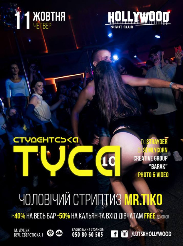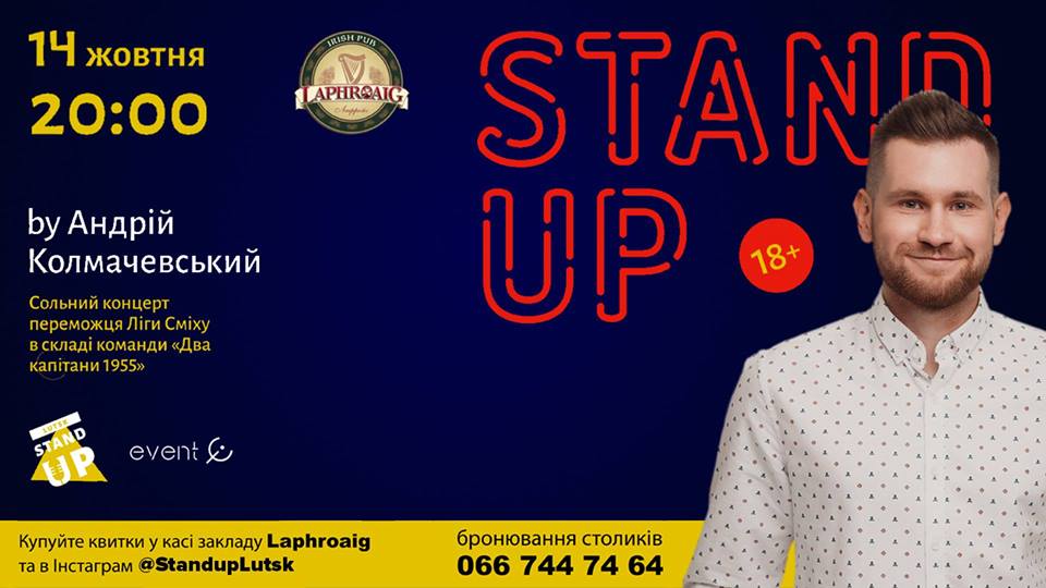 Зустріч «Листи місту. Що ти залишиш після себе?» у РЦ «Промінь» | 11 жовтняСтудентська туса в нічному клубі «Hollywood» | 11 жовтняКонцерт «Музичні діалоги» в Художньому музеї міста Луцька | 11 жовтняBeer Mix: дискотівка на будь-який смак у пивному клубі «Оболонь» | 12 жовтняПрезентація книжки Артема Чапая «The Ukraine» у книгарні «Є» | 12 жовтняВистава «Замовляю любов» у Волинському обласному академічному театрі імені Тараса Шевченка | 12 жовтняКонцерт гурту «Хорея Козацька» в Палаці культури міста Луцька | 13 жовтняPlasTalks від Юрка Дідули: як відповідальність змінює людей у Молодіжному центрі Волині | 13 жовтняКонцерт гурту «WSZYSTKO» в пивному клубі «Оболонь» | 13 жовтняВистава «Сексуальне чтиво» від київського театру «Чорний квадрат» у РЦ «Промінь» | 13 жовтняКонцерт гурту «Медовий полин» у пивному клубі «Майдан» | 13 жовтняФестиваль танців «Volyn Dance Festival – 2018» в «Адреналін Сіті» | 13–14 жовтняУкраїнська дискотівка на Покрову в пивному клубі «Оболонь» | 14 жовтняStand up by Андрій Колмачевський у ірландському пабі «Laphroaig» | 14 жовтняКонцерт до Дня Покрови Пресвятої Богородиці, Дня захисника України у Волинському обласному академічному театрі імені Тараса Шевченка | 14 жовтняЗакриття XV музичного фестивалю «Стравінський та Україна» у Волинській обласній філармонії | 14 жовтняВистава «Котигорошко, або Хлопчик з зеленого стручка» у Волинському обласному академічному театрі імені Тараса Шевченка | 14 жовтняВистава «Чарівна лампа Аладіна» у Волинському обласному академічному театрі імені Тараса Шевченка | 14 жовтняТролі шоу в Палаці культури міста Луцька | 15 жовтняКонцерт «Мамахохотала» у РЦ «Промінь» | 18 жовтняКонцерт «Дизель шоу» у Волинському обласному академічному театрі імені Тараса Шевченка | 18 жовтняWalk_For_Freedom_Lutsk від Театрального майдану | 18 жовтня
