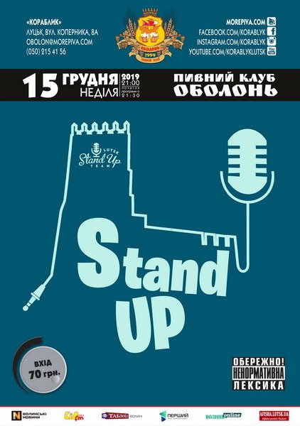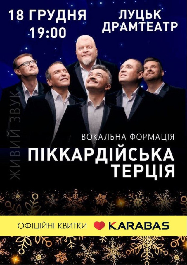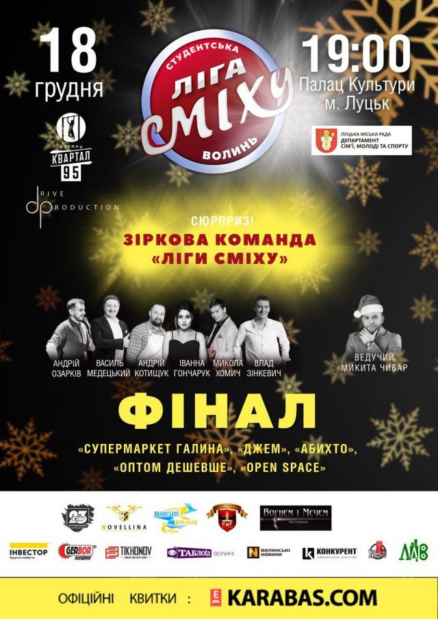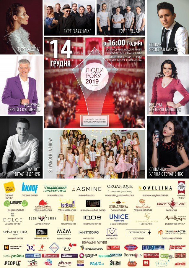 Концерт Оксани Мухи у Волинському облмуздрамтеатрі | 13 грудняЛекція Олександра Котиса «Цукерні і кав'ярні міжвоєнного Луцька» у книгарні «Є» | 13 грудняВистава «Повернення в Соренто» у Волинському облмуздрамтеатрі | 13 грудняСмачна Дискотiвка в пивному клубі «Оболонь» | 13 грудняПремія «Люди Року-2019. Волинь» у Волинському облмуздрамтеатрі | 14 грудняГурт «MERY D WHITE» у пивному клубі «Оболонь» | 14 грудняХІХ Міжнародний фестиваль сучасної імпровізаційної музики Jazz Bez у Палаці культури міста Луцька | 14–15 грудняПрезентація книжки Галини Вдовиченко «Найважливіше – наприкінці» у книгарні «Є» | 15 грудняВистава «Сонечко і снігові чоловічки» у Волинському облмуздрамтеатрі | 15 грудняБлагодійний забіг Миколаїв у Луцьку від ПортCity | 15 грудняSTAND UP вечiрка в пивному клубі «Оболонь» | 15 грудняВистава «Безталанна» у Волинському облмуздрамтеатрі | 15 грудняБухта пригод у РЦ «Промінь» | 17 грудняАртем Степанюк у клубі «Цитра» | 17 грудняПіккардійська Терція у Волинському облмуздрамтеатрі | 18 грудняФінал першого сезону сезон студентської «Ліги сміху Волинь» у Палаці культури міста Луцька | 19 грудня