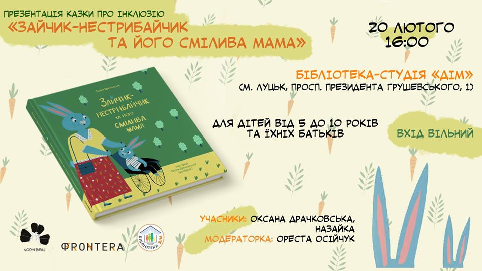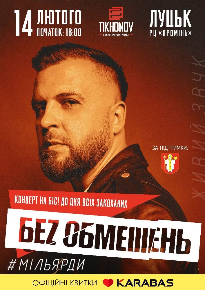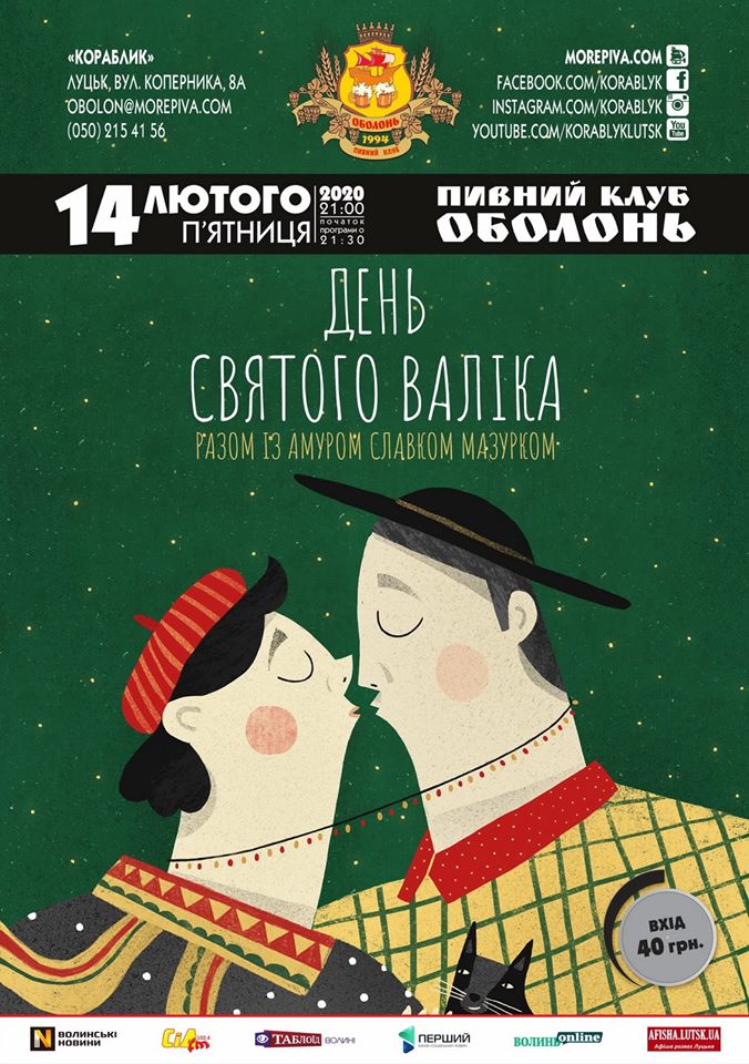 Lords of the Sound «Love Story» у РЦ «Промінь» | 13 лютогоВистава «Замовляю любов» у Волинському академічному обласному музично-драматичному театрі імені Тараса Шевченка | 13 лютогоКонцерт НА БІС! «Без Обмежень» з альбомом #Мільярди у РЦ «Промінь» | 14 лютогоДЕНЬ СВЯТОГО ВАЛIКА. Вечiрка. Ведучий – Slavko MazuRock у пивному клубі «Оболонь» | 14 лютогоАртем Степанюк - Романтичні хіти під гітару в клубі «Цитра» | 14 лютогоПрезентація збірки Юлі Фінковської «Лиця ялиці» в книгарні «Є» | 14 лютогоДрама абсурду «Коханець» у Гармидер ангар-stage | 15 лютогоТанці на палубі Кораблика: від 60-х і до сьогодні в пивному клубі «Оболонь» | 16 лютого Вистава «Циганка Аза» у Волинському академічному обласному музично-драматичному театрі імені Тараса Шевченка | 16 лютогоМузична вистава «У нас усе добре» в Гармидер ангар-stage | 16 лютогоVinyl party до дня народження Чеслава Немена в клубі «Цитра» | 16 лютогоВистава «Жила-була Сироїжка» у Волинському академічному обласному музично-драматичному театрі імені Тараса Шевченка | 16 лютогоПрезентація казки «Зайчик-нестрибайчик та його смілива мама» в Луцькій центральній бібліотеці для дітей | 20 лютогоВистава «Шельменко-денщик» у Волинському академічному обласному музично-драматичному театрі імені Тараса Шевченка | 20 лютого