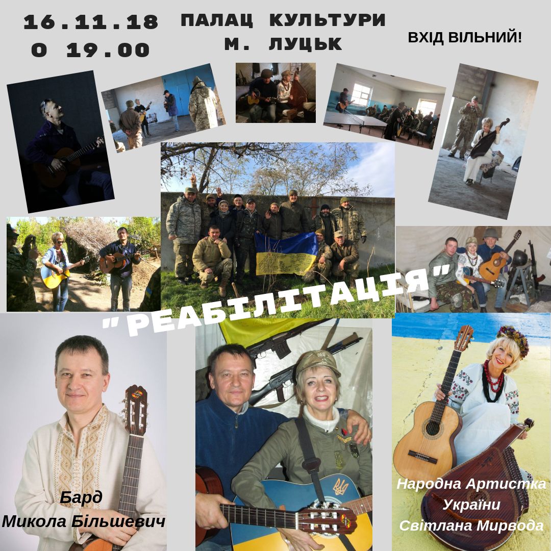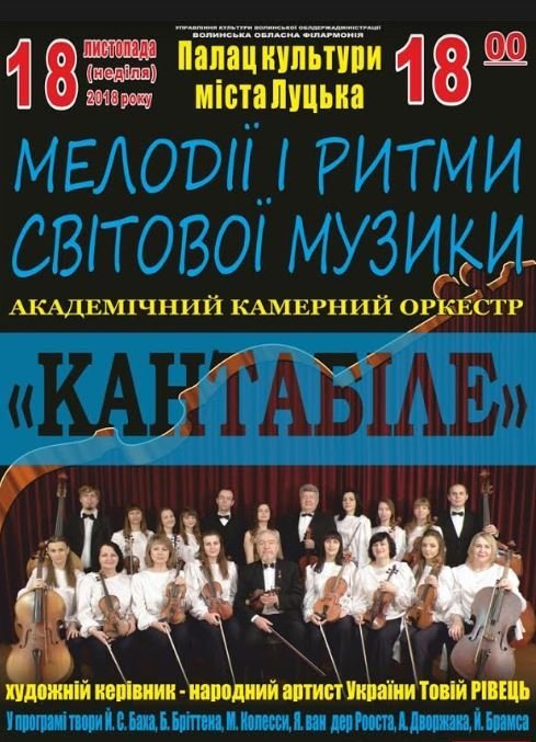 Відкриття виставки VIII Міжнародного пленеру іконопису та сакрального мистецтва в Замлинні на Волині «Знаки часу» | 15 листопадаКонцерт гурту KAZKA у нічному клубі «ХХІ століття» | 15 листопадаКонцерт Kiev Tango Project у Волинському обласному академічному музично-драматичному театрі імені Тараса Шевченка | 16 листопадаГоцалки в пивному клубі «Оболонь» | 16 листопадаВолонтерський концерт «Реабілітація» в Палаці культури міста Луцька | 16 листопадаВистава «На Івана Купала» у Волинському академічному обласному театрі ляльок | 16 листопадаВистава «Нестерпні люди, або Наречений з Єрусалиму» у Волинському обласному академічному музично-драматичному театрі імені Тараса Шевченка | 16 листопадаІ Міжнародний літературний фестиваль «Фронтера» | 16–18 листопада«День студента». Вечірка в пивному клубі «Оболонь» | 17 листопадQuizКОТЕка. Фінальна гра в ірландському пабі Laphroaig | 17 листопадЛекційний семінар для батьків «Маленькі діти: як їм живеться та про що думається» у Центрі психології та психотерапії | 17 листопадаВистава «Номер 13 (Неймовірні пригоди в готелі класу LUX)» у Волинському обласному академічному музично-драматичному театрі імені Тараса Шевченка | 18 листопадаКонцерт Джамали у РЦ «Промінь» | 18 листопадаВистава «Дитина в дарунок» у Волинському обласному академічному музично-драматичному театрі імені Тараса Шевченка | 18 листопадаКонцерт академічного камерного оркестру «Кантабіле» у Волинській обласній філармонії | 18 листопадаКонцерт гурту «Naviband» у Палаці культури міста Луцька | 18 листопадаКонцерт гурту «YEGANOV PROJECT» у пивному клубі «Оболонь» | 18 листопадаВистава «Вінні Пух і всі, всі, всі...» у Волинському академічному обласному театрі ляльок | 18 листопадаВистава «Стережися лева» у Волинському обласному академічному музично-драматичному театрі імені Тараса Шевченка | 18 листопадаФайна гутірка з Маєю Москвич у магазині туристичного спорядження «Альпініст» | 19 листопадаКонцерт гумористичного дуету «Брати Шумахери» у РЦ «Промінь» | 20 листопадаВистава «Про що мріють зірки» у Волинському академічному обласному театрі ляльок | 22 листопадаТиждень українського кіно в кінотеатрі Адреналін | 22 листопадаКонцерт гурту «Бумеранг» у Палаці культури міста Луцька | 22 листопада