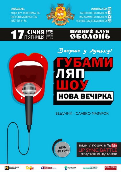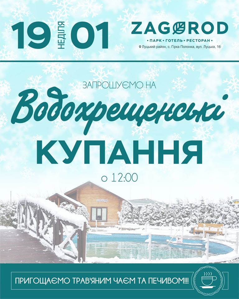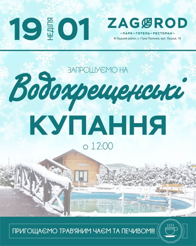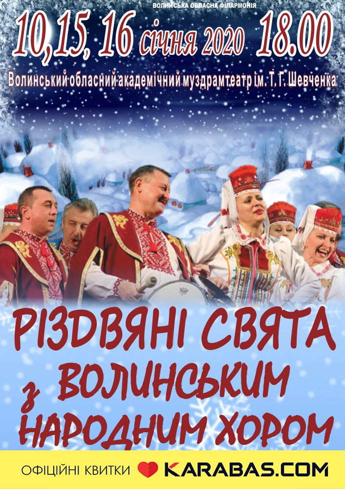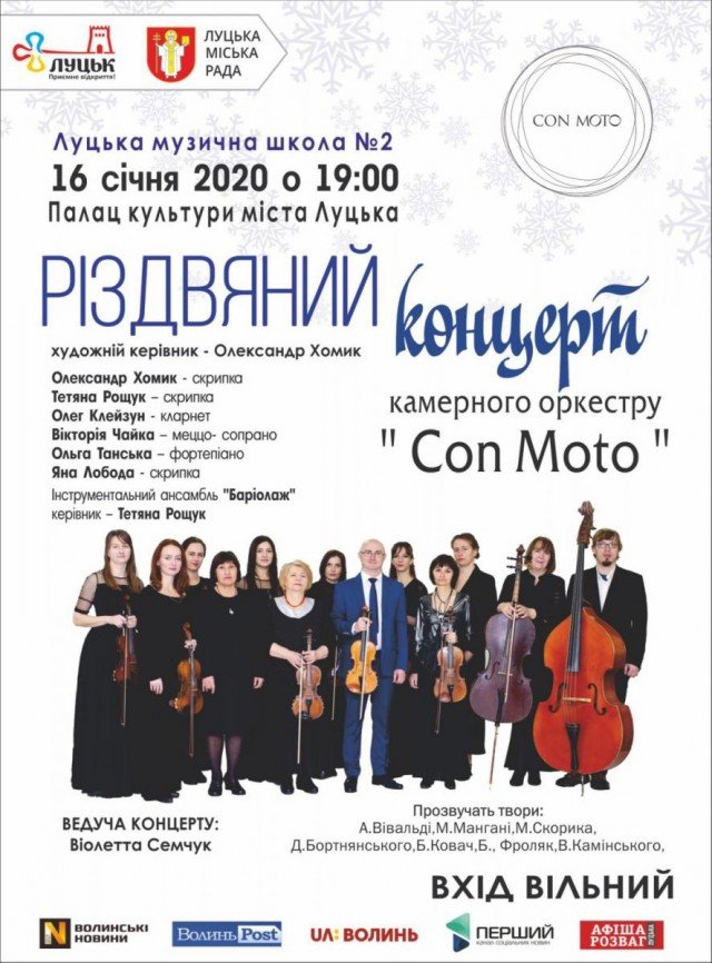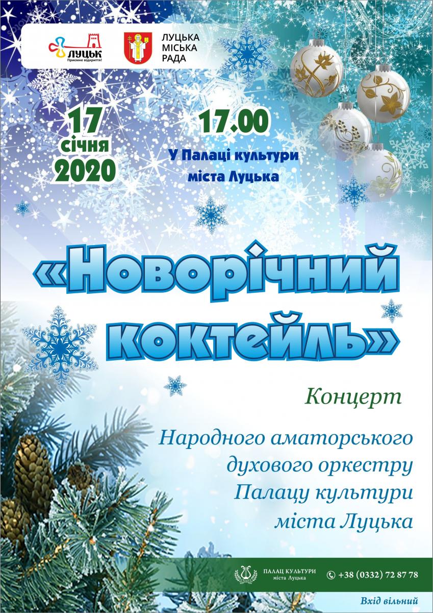 Різдвяний концерт камерного оркестру «Con Moto» у Палаці культури міста Луцька | 16 січняРіздвяні свята з Волинським народним хором у Волинському академічному обласному музично-драматичному театрі імені Тараса Шевченка | 16 січня«Світ у 2020». Розмова з Дмитром Крапивенком у книгарні «Є» | 17 січняВистава «Ведмідь. Пропозиція» у Волинському академічному обласному музично-драматичному театрі імені Тараса Шевченка | 17 січняМикола Більшевич – Українська бардівська пісня у клубі «Цитра» | 17 січняЗабава «ГУБАМИ ЛЯП ШОУ». Ведучий – Славко Мазурок у пивному клубі «Оболонь» | 17 січня Коляда з Тетяною Ціхоцькою у Волинському академічному обласному музично-драматичному театрі імені Тараса Шевченка | 17 січняНоворічний коктейль у Палаці культури міста Луцька | 17 січняРіздвяна ніч у Волинському академічному обласному музично-драматичному театрі імені Тараса Шевченка | 18, 23 січняРадiоХiти. Танцi в пивному клубі «Оболонь» | 18 січняMery D White в «Цитрі» | 18 січняВодохрещенські купання у ресторані Zagorod | 19 січняРіздвяний концерт у Волинському академічному обласному музично-драматичному театрі імені Тараса Шевченка | 19 січняВистава «Лисичка-Сестричка та Вовк-Панібрат» у Волинському академічному обласному музично-драматичному театрі імені Тараса Шевченка | 19 січняГурт «NEGODA» у пивному клубі «Оболонь» | 19 січня Вистава «День народження кота Леопольда» у Волинському академічному обласному музично-драматичному театрі імені Тараса Шевченка | 19 січняВідкриття фотовиставки «Невідомі світлини Чорновола» у Палаці культури міста Луцька | 20 січняAvokaduo (Чехія) спонтанний концерт у клубі «Цитра» | 21 січня