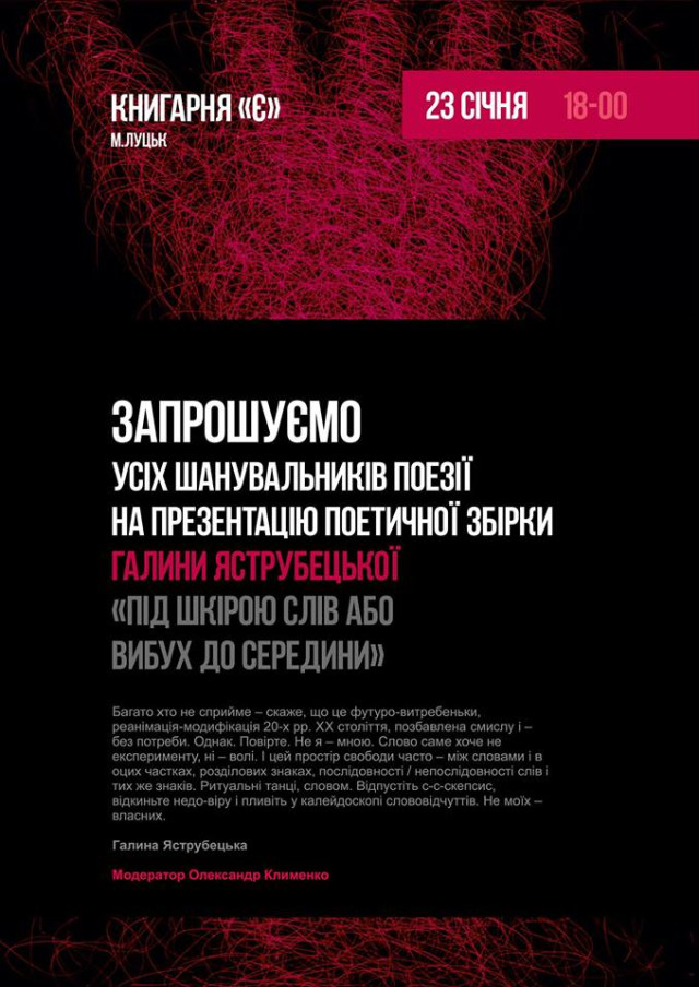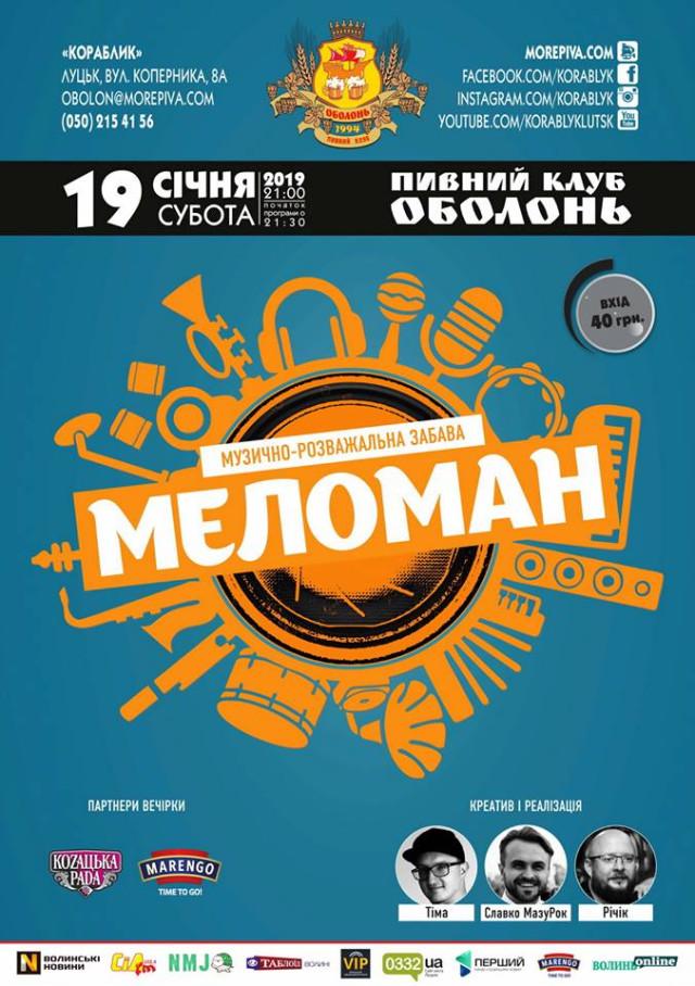Різдвяні свята з Волинським народним хором у Волинському академічному обласному українському музично-драматичному театрі імені Тараса Шевченка | 17 січняВистава «Обережно – жінки» у Волинському академічному обласному українському музично-драматичному театрі імені Тараса Шевченка | 17 січняЛише вершки: 1990-2018. Танці в пивному клубі «Оболонь» | 18 січня«Чорні черешні». Вечір гарної атмосфери та хорошої музики в пивному клубі «Майдан» | 18 січняМузично-розважальна забава «МЕЛОМАН» у пивному клубі «Оболонь» | 19 січняВелике освячення води в Луцьку | 19 січняРіздвяний концерт у Волинському обласному академічному музично-драматичному театрі імені Тараса Шевченка | 19 січняВистава «Вікентій Прерозумний» у Волинському обласному академічному музично-драматичному театрі імені Тараса Шевченка | 20 січняSTAND UP вечірка в пивному клубі «Оболонь» | 20 січняВеселий маскарад у Волинському академічному обласному театрі ляльок | 20 січняРіздвяна ніч у Волинському обласному академічному музично-драматичному театрі імені Тараса Шевченка | 20 січняЖивий ланцюг у Луцьку | 22 січняПрезентація збірки Галини Яструбецької «Під шкірою слів» у книгарні «Є» | 22 січняКонцерт Ірини Федишин «Україна колядує» у Волинському обласному академічному музично-драматичному театрі імені Тараса Шевченка | 23 січняВистава «Шельменко-денщик» у Волинському обласному академічному музично-драматичному театрі імені Тараса Шевченка | 24 січняЛекція «(Не)відомі волиняни: від німого кіно до «Оскарів» у книгарні «Є» | 24 січня