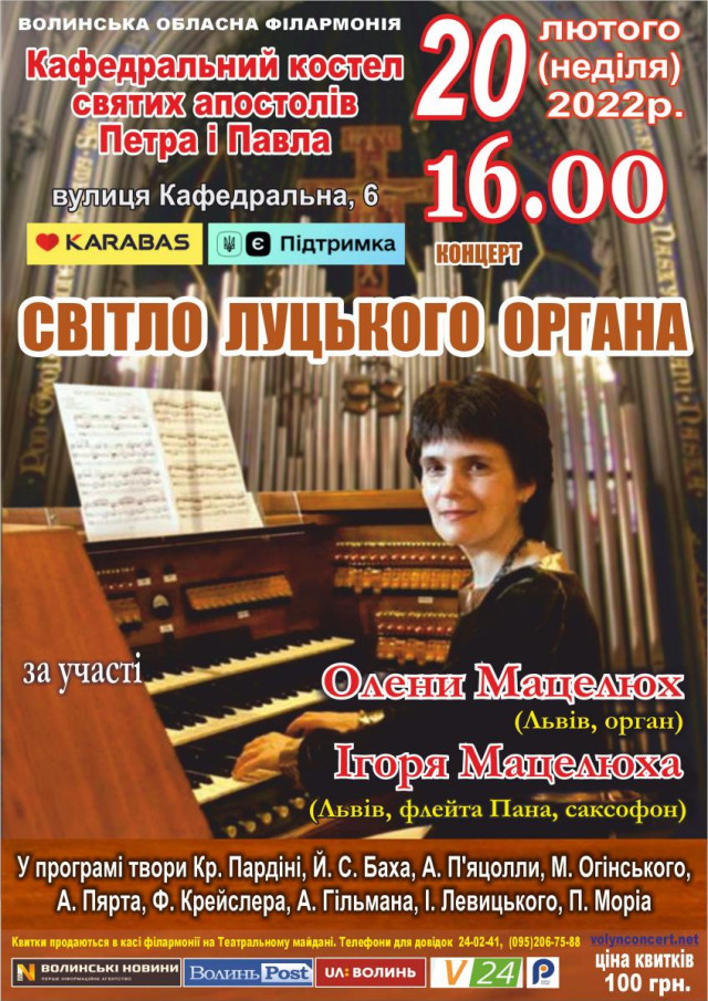 Ораторський клуб «Демосфен» у Молодіжному центрі Волині | 17 лютогоГурт «Курган і Агрегат» з презентацією нового альбому «Зембонджу» у ГаРмИдЕр ангар-stage | 18 лютогоСимфонічний оркестр GosОrchestra у Волинському академічному музично-драматичному театрі імені Тараса Шевченка | 18 лютогоФранцузька комедія на одну дію «Обережно – жінки» у Волинському академічному музично-драматичному театрі імені Тараса Шевченка | 18 лютогоАкустичний вечір «Просто співай» у Луцькому національному технічному університеті | 18 лютогоМайстер-клас для дітей «Кішка Пушин» у художній студії «Барва» | 18 лютогоВистава «Лисиця, що впала з неба» у Волинському академічному обласному театрі ляльок | 19 лютогоМюзикл «Життя в кредит (Едіт Піаф)» у Волинському академічному музично-драматичному театрі імені Тараса Шевченка | 19 лютогоКонцерт «Світло луцького органа» у кафедральному костелі Святих Апостолів Петра і Павла | 20 лютогоВистава «Мауглі» у Волинському академічному обласному театрі ляльок | 20 лютогоВистава «Лісова пісня» у Волинському академічному музично-драматичному театрі імені Тараса Шевченка | 20 лютогоВистава «Біда навчить» у Волинському академічному музично-драматичному театрі імені Тараса Шевченка | 20 лютогоЗустріч-семінар для гідів «Інклюзивна екскурсія містом: яка вона?» у Центрі туристичної інформації та послуг | 21 лютогоВистава «Камінний господар» у Волинському академічному обласному театрі ляльок | 21, 22 лютогоВистава «Велосипед з червоними колесами» у Волинському академічному музично-драматичному театрі імені Тараса Шевченка | 23 лютогоВистава «Абрикосовий рай» у Волинському академічному музично-драматичному театрі імені Тараса Шевченка | 23 лютогоВистава «Лісова пісня» у Волинському академічному обласному театрі ляльок | 23, 24 лютогоНаціональний балет Грузії «Сухішвілі» у Волинському академічному музично-драматичному театрі імені Тараса Шевченка | 24 лютогоВистава «Мільйон парашутиків» у Волинському академічному музично-драматичному театрі імені Тараса Шевченка | 24 лютогоАрсен Мірзоян у Волинському академічному музично-драматичному театрі імені Тараса Шевченка | 25 лютого