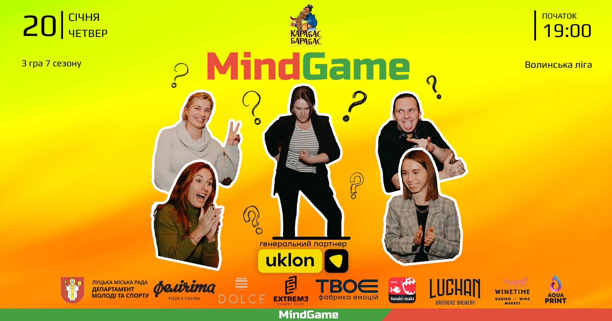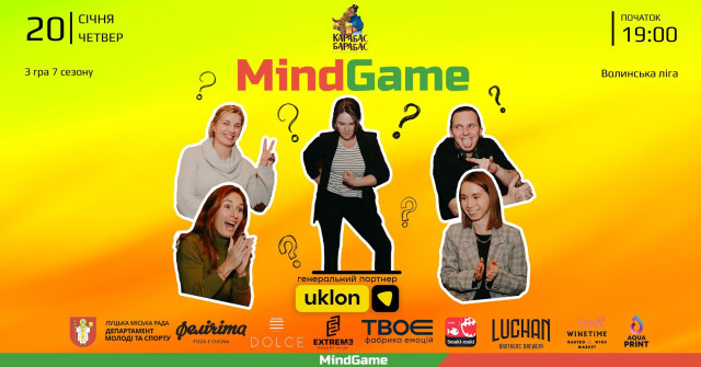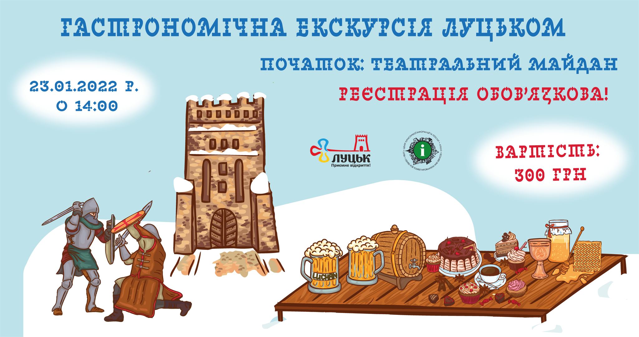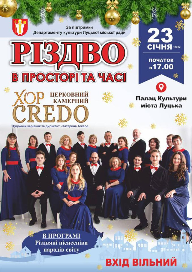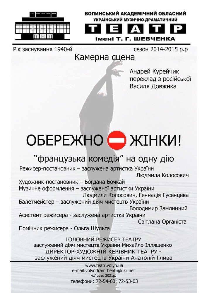 Вистава «Замовляю любов» у Волинському академічному музично-драматичному театрі імені Тараса Шевченка | 20 січняMIND GAME у броварні «Карабас Барабас» | 20 січняВистава «Ведмідь. Пропозиція» у Волинському академічному музично-драматичному театрі імені Тараса Шевченка | 21 січняМайстер-клас для дітей «Утя» в художній студії «Барва» | 21 січня«Флайzzza» у пивному клубі «Оболонь» | 22 січняМюзикл «Життя в кредит (Едіт Піаф)» у Волинському академічному музично-драматичному театрі імені Тараса Шевченка | 22 січняСтворення живого «ланцюга єднання» до Дня Соборності України на Театральному майдані | 22 січняВистава «Вінні Пух і всі, всі, всі…» у Волинському академічному обласному театрі ляльок | 22 січня«Історія успіху: «Yoga Territory» – територія йоги» у Молодіжному центрі Волині | 22 січняГастрономічна екскурсія Луцьком від Театрального майдану | 23 січняВистава «Така жизнь» за п’єсою Олени Шевченко у Гармидер ангар-stage | 23 січня«Ритмотека» в пивному клубі «Оболонь» | 23 січняКомічна опера на дві дії «Наталка Полтавка» у Волинському академічному музично-драматичному театрі імені Тараса Шевченка | 23 січняРіздвяний концерт церковного камерного хору «CREDO» у Палаці культури міста Луцька | 23 січняВистава «Котигорошко, або Хлопчик з зеленого стручка» у Волинському академічному обласному театрі ляльок | 23 січняКараоке «Зупинися, щастя мить…» у BOREMEL HILLS | 24 січняМузичний квіз у Pub Oldskull | 25 січняФранцузька комедія на одну дію «Обережно – жінки» у Волинському академічному музично-драматичному театрі імені Тараса Шевченка | 28 січня