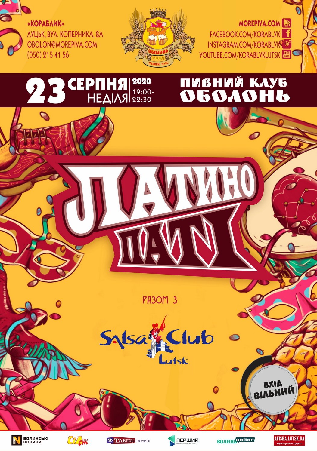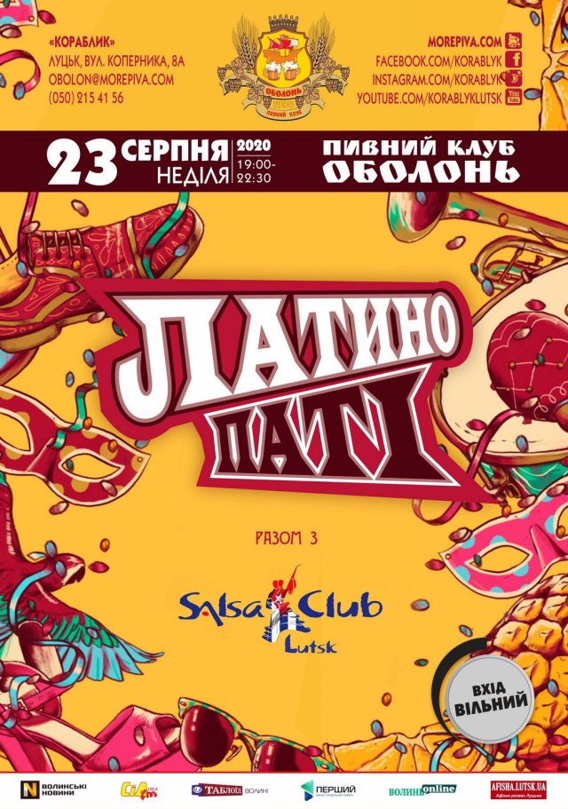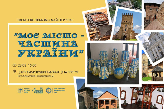 Читайте більше: У Луцьку «оживуть» мурали: фестиваль «Lutsk Wallking» запрошує шанувальників стріт-артуЛатино Танцульки з Сальса Клубом у клубі «Оболонь»| 23 серпняКонцерт духовної музики «Alleluia» Академічного камерного оркестру «Кантабіле» у Волинській обласній філармонії | 23 серпняЕкскурсія Луцьком «Моє місто – частина України» та майстер-клас «Виготовлення різьбленої свічки» від Центру туристичної інформації та послуг | 23 серпняОстання вечірка літа в Maximus Rest | 23 серпняСвяткування Дня Незалежності в Луцьку | 23-24 серпняВелопробіг до Дня Незалежності від Театрального майдану | 24 серпняМайстер-клас із текстильної іграшки в Луцькому міському молодіжному центрі | 24 серпняFuckup Nights Lutsk vol. V від PRO Business HUB | 27 серпня