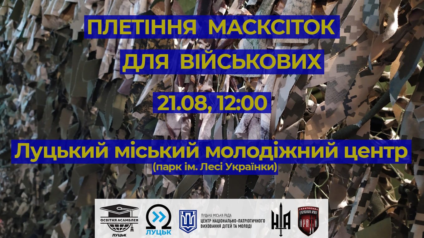 Тренінг «Чому ТОБІ не обійтися без критичного мислення» у Молодіжному центрі Волині | 20 серпняВечірній сплав річкою Стир від будинку архітектора Миколи Голованя | 20 серпняКіноперегляд фільму «Гуцулка Ксеня» у «Луцькій Венеції» | 20 серпняПлетіння масксіток для військових у Луцькому молодіжному центрі | 21 серпняПрогулянка на катері «На одній хвилі» від будинку архітектора Миколи Голованя | 22 серпняВиступ гурту «MERY D WHITE» (Луцьк) у клубі «Оболонь»| 22 серпня99 друзів Галича у Гармидер ангар-stage | 22 серпняСтріт-арт фестиваль «Lutsk Wallking» | 22-23 серпня