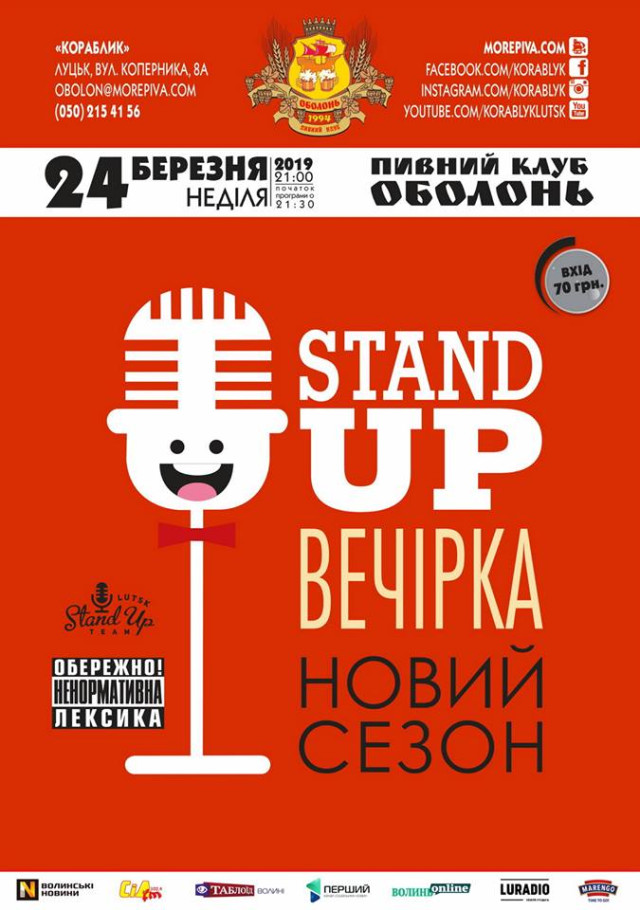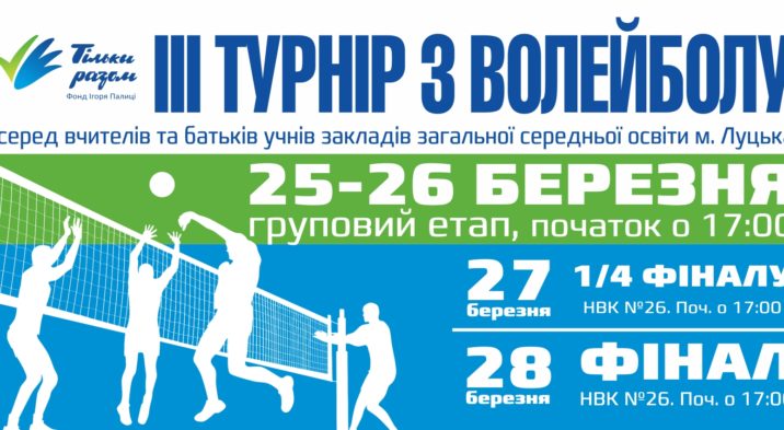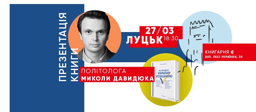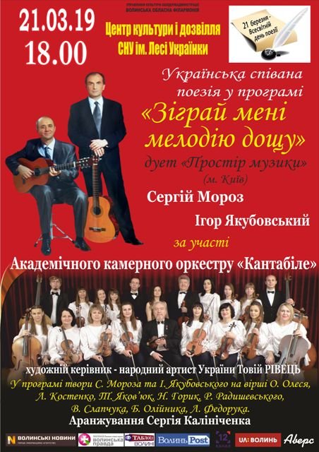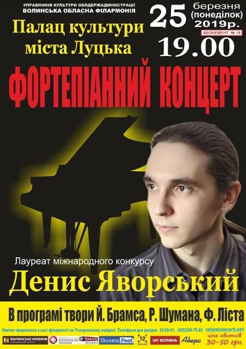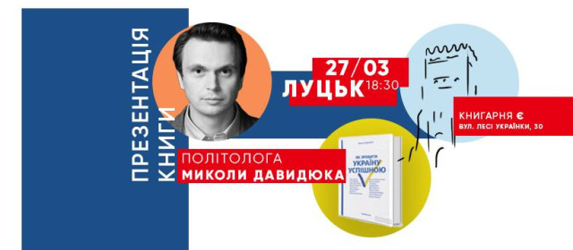 Концерт «Зіграй мені мелодію дощу» в Центрі культури і дозвілля Східноєвропейського національного університету імені Лесі Українки | 21 березняЖіночий квартал у РЦ «Промінь» | 21 березняВідкриття обласної художньої виставки «Весняний салон» у Галереї мистецтв | 21 березняОлег Скрипка та оркестр НАОНІ у Волинському обласному академічному музично-драматичному театрі імені Тараса Шевченка | 22 березняНарешті п’ятниця! Відривна дискотівка в пивному клубі «Оболонь» | 22 березняПрезентація альбому «Перший відмін ок» у Музеї сучасного українського мистецтва Корсаків | 22 березняЧорні черешні. Вечір гарної атмосфери та хорошої музики в пивному клубі «Майдан» | 22 березняКурси молодого мандрівника в приміщенні Молодіжного центру Волині | 22 березняВистава «Замовляю любов» у Волинському обласному академічному музично-драматичному театрі імені Тараса Шевченка | 22 березняКіноперегляд стрічки українського виробництва «Герой мого часу» у приміщенні Молодіжного центру Волині | 22 березняПрезентація книги «З вами буде говорити скульптор» у ПортСіті | 22 березняБранч для наречених 4.0 у Passage Interdit | 23 березняМатч першої ліги чемпіонату України «Волинь» – «Авангард» | 23 березняВистава «Шельменко-денщик» у Волинському обласному академічному музично-драматичному театрі імені Тараса Шевченка | 23 березняТиха вечірка в приміщенні Молодіжного центру Волині | 23 березняДиско 80-х у пивному клубі «Оболонь» | 23 березняВистава «Три ідеальні подружжя (Анатомія зради)» у Волинському обласному академічному музично-драматичному театрі імені Тараса Шевченка | 24 березняКонцерт Єгора Грушина в Палаці культури міста Луцька | 24 березняSTAND UP вечірка в пивному клубі «Оболонь» | 24 березняВистава «Біда навчить» у Волинському обласному академічному музично-драматичному театрі імені Тараса Шевченка | 24 березняКонцерт піаніста Дениса Яворського в Палаці культури міста Луцька | 25 березняІІІ турнір з волейболу серед вчителів та батьків учнів луцьких шкіл у спортзалі НВК № 26 | 25–28 березняПрезентація книжки Іри Баковецької-Рачковської «Пластилін» у книгарні «Є» | 26 березняARTEFACT.еvents з Андрієм Сіруком у бізнес-центрі «Директорія» | 27 березняПрезентація книжки Миколи Давидюка «Як зробити Україну успішною» в книгарні «Є» | 27 березняЛекція «Жорж Санд зі слов’янських земель. Габріеля Запольська» у Волинському краєзнавчому музеї | 27 березняТренінг «Про що писати в Facebook та Instagram?» | 28 березня