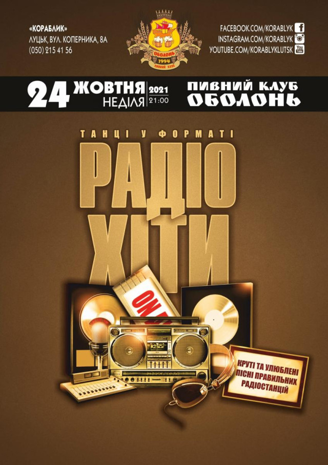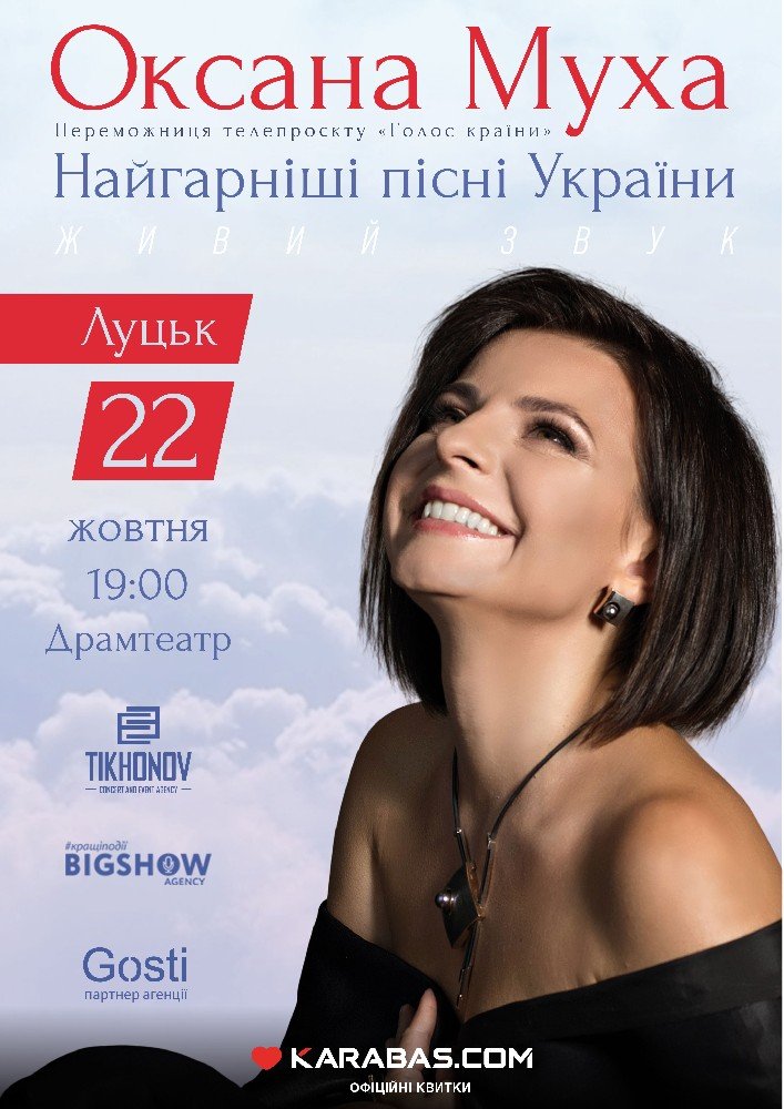 Оксана Муха із найгарнішими піснями України у Волинському академічному театрі імені Тараса Шевченка | 22 жовтняМайстерка для дітей «Осінній вінок» у художній студії «Барва» | 22 жовтняВистава «Ведмідь. Пропозиція» у Волинському академічному театрі імені Тараса Шевченка | 22 жовтняЛекція професора Юрія Чорноморця «Сучасне православне богослов’я і нові тенденції в соціальному вченні» у Волинській православній богословській академії | 22 жовтняГурт «ЧІП» у пивному клубі «Оболонь» | 23 жовтняВистава «Лісова пісня» у Волинському академічному театрі імені Тараса Шевченка | 23 жовтняАндрій Щегель із «Національно-визвольним сольником» у Гармидер ангар-stage | 23 жовтня12 тур УПЛ. НК Верес – Маріуполь на стадіоні «Авангард» | 23 жовтняАнтикорупційна екскурсія Луцьком на честь дня народження «Сили правди» від скверу Зоряний | 23 жовтняВистава «Як горобець розуму шукав» у Волинському академічному обласному театрі ляльок | 24 жовтня«Радіохіти. Танці» в пивному клубі «Оболонь» | 24 жовтняВистава «Мауглі» у Волинському академічному обласному театрі ляльок | 24 жовтняМузична інклюзивна вистава «У чужому пір’ї» у Волинському академічному обласному театрі ляльок | 24 жовтняБлагодійний концерт гурту зі США Texas Country Boys у кірсі «Дім Євангелія» | 24 жовтняВистава «Бременські музиканти» у Волинському академічному театрі імені Тараса Шевченка | 24 жовтняVivienne Mort у Волинському академічному театрі імені Тараса Шевченка | 25 жовтняСпектакль «Джекпот для Какаду» у Волинському академічному театрі імені Тараса Шевченка | 25 жовтняЛюбомир Мельник із презентацією нового альбому у Волинському академічному театрі імені Тараса Шевченка | 26 жовтняВистава «Не шукайте щастя, бо я його украв» у Волинському академічному театрі імені Тараса Шевченка | 28 жовтня