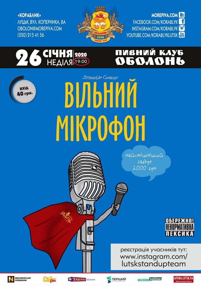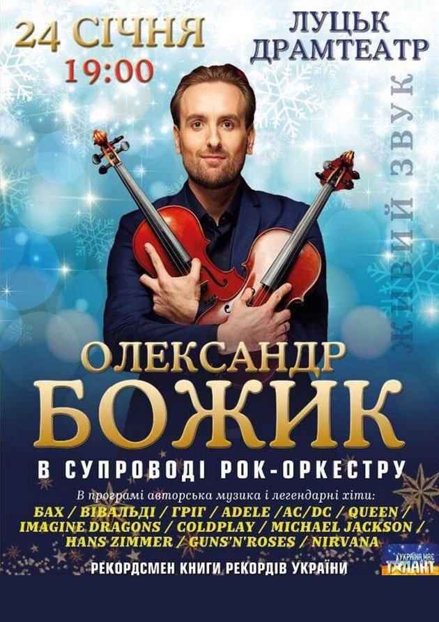 Концерт Олександра Божика у Волинському обласному академічному музично-драматичному театрі імені Тараса Шевченка | 24 січняНарештi п'ятниця! Вiдривна дискотiвка в пивному клубі «Оболонь» | 24 січняПрезентація фільму «Соловей співає. Доки голос має» в Палаці культури міста Луцька | 24 січняВистава «Замовляю любов» у Волинському обласному академічному музично-драматичному театрі імені Тараса Шевченка | 24 січняВідкриття виставки Ольги Кузюри «Втрачена присутність» у Музеї сучасного українського мистецтва Корсаків | 24 січняПрезентація книжки Ірини Славінської «Мої запасні життя» | 24 січняДискоЛихоманка 70-80-90-х у пивному клубі «Оболонь» | 25 січняВистава «Століття Якова: перше кохання» у Волинському обласному академічному музично-драматичному театрі імені Тараса Шевченка | 25 січняЛітературний вечір у Львівській майстерні шоколаду | 25 січняНауковий пікнік для дітей та дорослих у РЦ «Промінь» | 25 січняВистава «Дитина в дарунок» у Волинському обласному академічному музично-драматичному театрі імені Тараса Шевченка | 26 січняВільний мікрофон у пивному клубі «Оболонь» | 26 січняВистава «Сонечко і снігові чоловічки» у Волинському обласному академічному театрі ляльок | 26 січняТворча зустріч з творцями фільму «Наші котики» у PremierCity | 26 січняВистава «Коза-дереза» у Волинському обласному академічному музично-драматичному театрі імені Тараса Шевченка | 26 січняОксана Муха. Святковий концерт «Тиха Ніч» у Волинському обласному академічному музично-драматичному театрі імені Тараса Шевченка | 27 січня«Мода на українське: як у Луцьку будують текстильну імперію» у Палаці культури міста Луцька | 29 січняВоркшоп «Як visual врятує ваш бізнес?» у PRO Business HUB | 30 січняІсторія успіху. Як стати кращим в своїй професії в Молодіжному центрі Волині | 30 січняВистава «Безталанна» у Волинському обласному академічному музично-драматичному театрі імені Тараса Шевченка | 30 січня