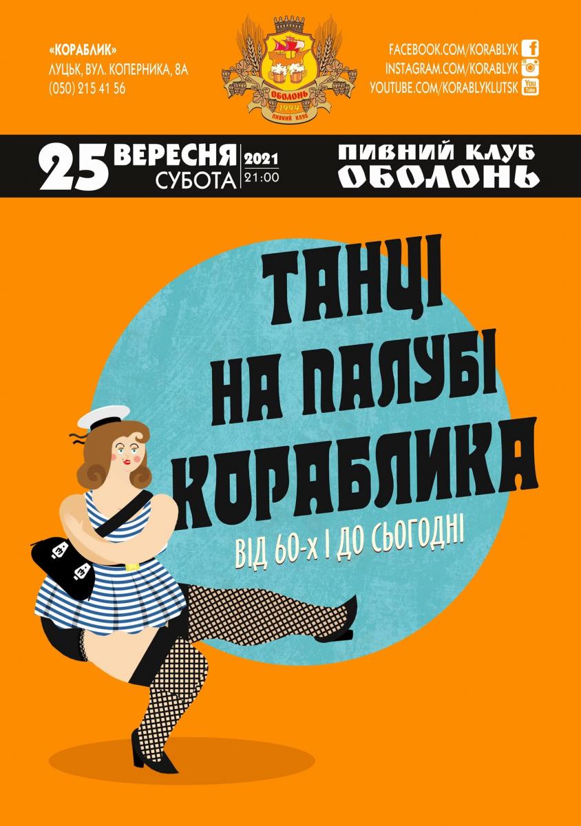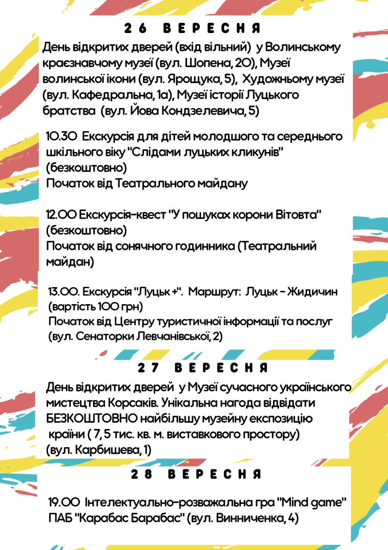 Хор Григорія Верьовки у Волинському обласному академічному музично-драматичному театрі імені Тараса Шевченка | 23 вересня«Осінь у Волинській Голландії» неподалік села Свидники | 23-26 вересняЄгор Шатайло «Тимчасові незручності» в Гармидер ангар-stage | 24 вересня«Смачна дискотівка» в пивному клубі «Оболонь» | 24 вересняГурт «Outcry» в пивному клубі «Майдан» | 24 вересняУкраїнський комедійний актор Тарас Стадницький з сольним StandUP «36,6+» в Палаці культури міста Луцька | 25 вересняЕкскурсія «Імена Луцька». Збір біля Центру туристичної інформації та послуг | 25 вересня«Танці на палубі «Кораблика»: від 60-х і до сьогодні» в пивному клубі «Оболонь» | 25 вересняГурт «DIONE» в пивному клубі «Майдан» | 25 вересняПряма трансляція бою Усика проти Джошуа в кінотеатрі PremierCity | 25 вересняВистава «Життя в кредит» у Волинському обласному академічному музично-драматичному театрі імені Тараса Шевченка | 25, 26 вересняЗаходи з нагоди Всеукраїнського дня туризму в Луцьку | 25-28 вересняГурт «MERY D WHITE» в пивному клубі «Оболонь» | 26 вересняВистава «Попелюшка» у Волинському обласному академічному музично-драматичному театрі імені Тараса Шевченка | 26 вересняВсеукраїнський турнір із футболу «Кубок єднання» в Луцьку | до 26 вересняКонцерт «Джекпот» у Волинському обласному академічному музично-драматичному театрі імені Тараса Шевченка | 27 вересняВистава «Жениха викликали, дівчата?» у Волинському обласному академічному музично-драматичному театрі імені Тараса Шевченка | 29 вересняВідкрита лекція «Як написати книгу?» від Любка Дереша онлайн | 29 вересня