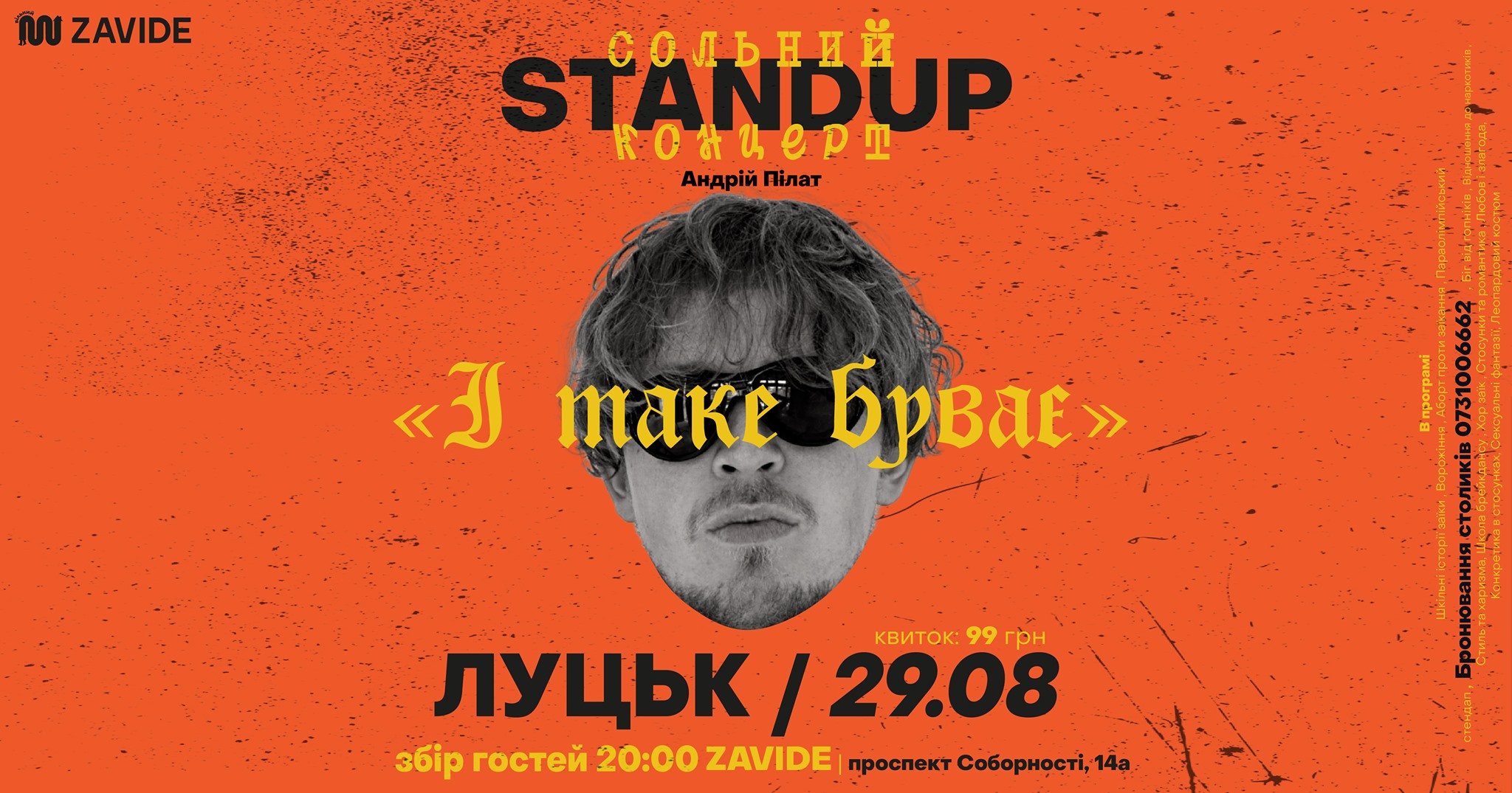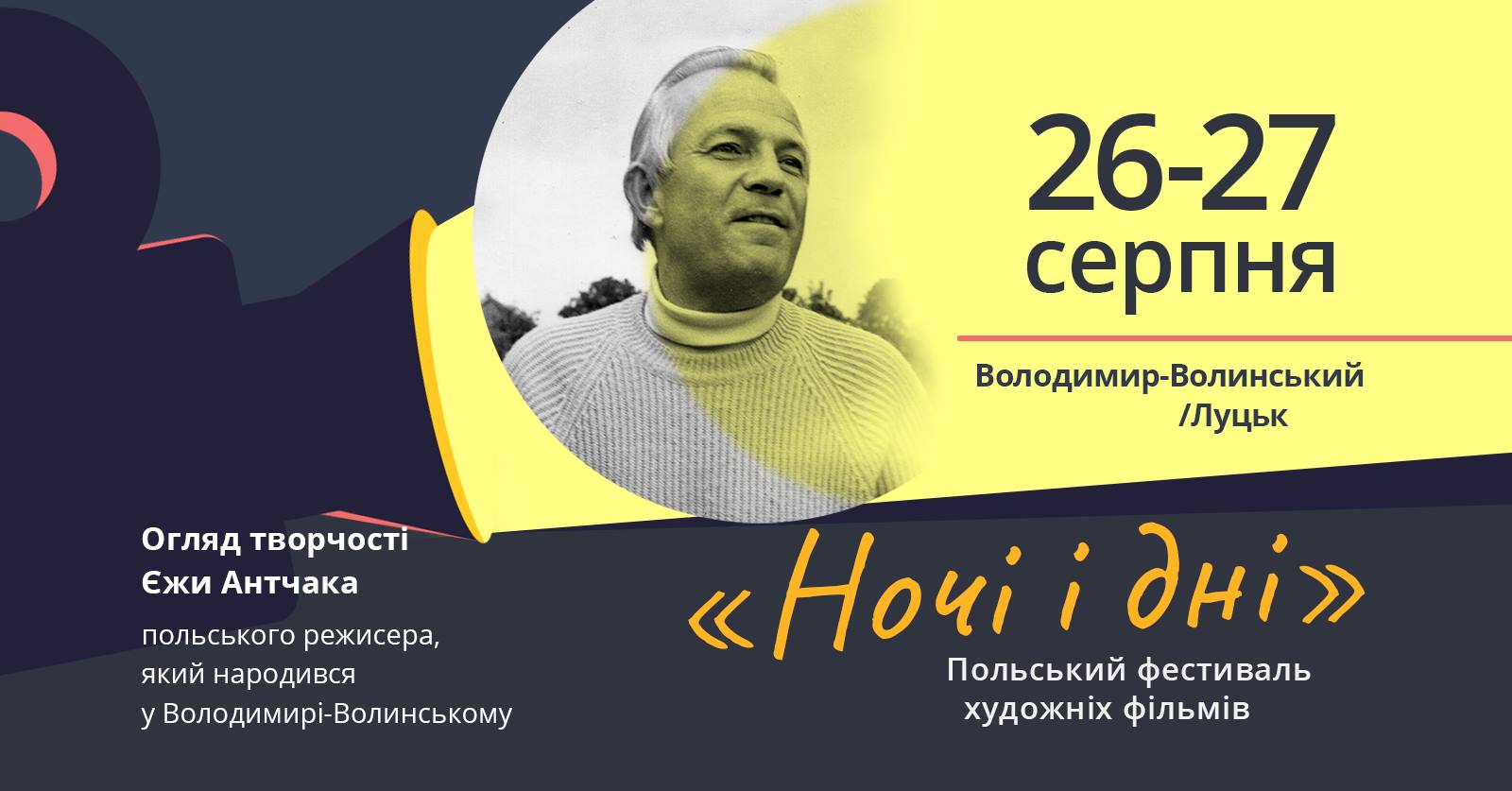 Фестиваль художніх фільмів Єжи Антчака «Ночі і дні» на площі перед РЦ «Промінь» | 27 серпняProm Party від Pro Women UA | 27 серпняСвяткування Дня поцілунків та примирення у ЦУМ | 27 серпняXIV Міжнародний джазовий фестиваль «Art Jazz Cooperation-2021» у Луцькому замку | 28 серпняПоказ фільму «Вусатий Фанк» у Гармидер ангар-stage | 29 серпняCпеціальний показ фільму «Зошит війни» у драмтеатрі | 29 серпняСольний стендап-вечір Андрія Пілата «І ТАКЕ БУВАЄ» у ZAVIDE | 29 серпня«DISCO SUPER STAR-90» – Ласковий май, Dr. Alban, C. C. Catch. Триб’ют шоу | 31 серпня«Імена твої, Україно». Концерт пісень на поезію Івана Корсака до 75-ї річниці відомого журналіста, прозаїка й поета | 3 вересняМайстер-клас «Техніки впливу в діловій комунікації» у George's Club | 3 вересняЛуцьк виходить на Всеукраїнський марш за тварин на Театральному майдані | 5 вересня