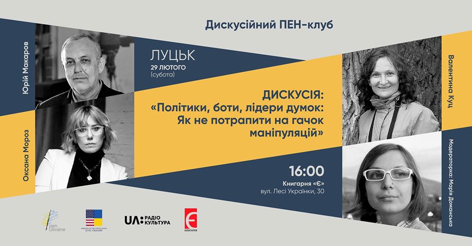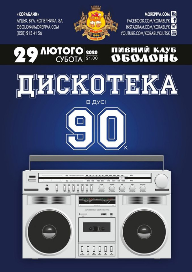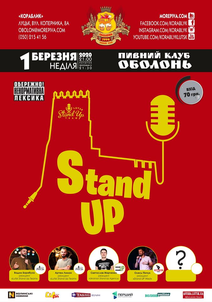 Fuckup Nights Lutsk vol. III у Passage Interdit | 27 лютогоВідкриття виставки «Панство на дозвіллі» у Волинському краєзнавчому музеї | 27 лютогоВистава «Лісова пісня» у Волинському обласному академічному музично-драматичному театрі імені Тараса Шевченка | 27 лютогоКатерина Рубан. Вірші. Багато віршів, дуже багато віршів у клубі «Цитра» | 27 лютогоКонцерт гурту «Бумбокс» у рамках туру «Таємний код: Рубікон» у Волинському обласному академічному музично-драматичному театрі імені Тараса Шевченка | 28 лютогоВиставковий проєкт відомого львівського художника Василя Бажая «UNTITLED III» у Музеї сучасного українського мистецтва Корсаків | 28 лютогоПрезентація альбому «Статус» у ZAVIDE | 28 лютогоBeer Mix: дискотівка на будь-який смак у пивному клубі «Оболонь» | 28 лютогоКіноперегляд з Михайлом Ющиком в аматорській кіностудії «Волинь» | 28 лютогоThe Royal City cover band у клубі «Цитра» | 28 лютогоЗустріч із ексміністром закордонних справ України Павлом Клімкіним «Майбутнє України: досягнення, виклики, загрози» у Палаці культури міста Луцька | 29 лютогоВистава-концерт «Монолог про найважливіше» в Гармидер ангар-stage | 29 лютогоДискусія «Як не потрапити на гачок маніпуляцій» у книгарні «Є» | 29 лютогоВистава «Шельменко-денщик» у Волинському обласному академічному музично-драматичному театрі імені Тараса Шевченка | 29 лютогоХiти 90-х. Танцi в пивному клубі «Оболонь» | 29 лютогоВистава «Про що мріють зірки» у Волинському обласному академічному музично-драматичному театрі імені Тараса Шевченка | 29 лютогоLutsk Fashion Weekend Spring 2020 у West Auto Hub | 29 лютогоMAX TAVRICHESKY unreal concert у клубі «Цитра» | 29 лютогоІнтенсив «Основи медіаграмотності» в Молодіжному центрі Волині | 29 лютого«У пошуках героя» та «Марвін» | 3 роки «ДогориДриґом» у Гармидер ангар-stage | 1 березняВистава «Присмерк» у Волинському обласному академічному музично-драматичному театрі імені Тараса Шевченка | 1 березняSTAND UP Вечірка в пивному клубі «Оболонь» | 1 березняВистава «Піколетто» у Волинському обласному академічному музично-драматичному театрі імені Тараса Шевченка | 1 березняВистава «Пригоди Піноккіо» у Волинському обласному академічному театрі ляльок | 1 березня